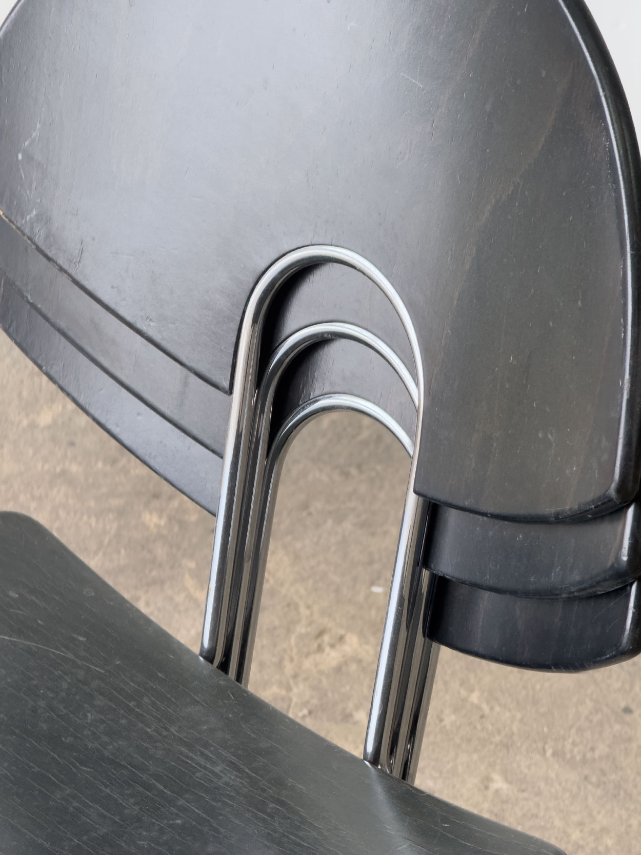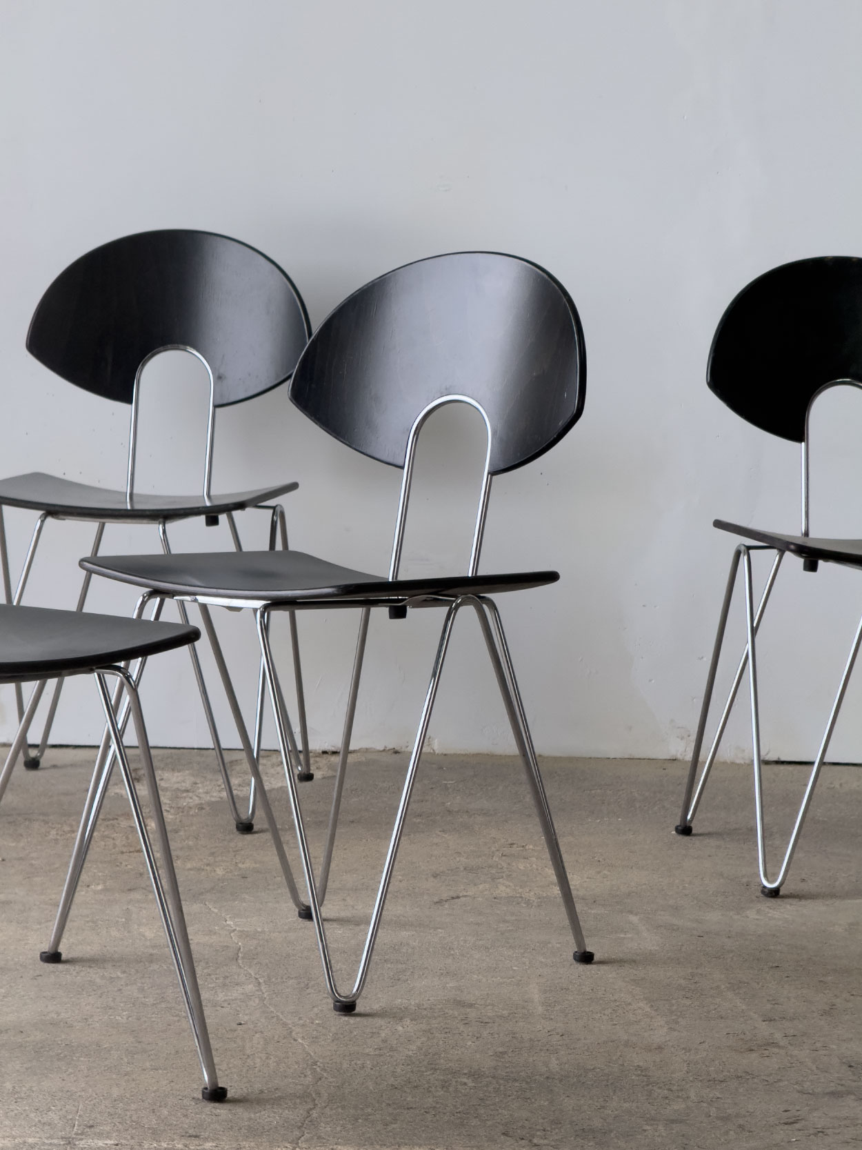 Postmodernistyczne krzesła Mikado 1800 w kolorze czarnym. Zaprojektowane w 1979 roku przez Waltera Leemana, wyprodukowane przez renomowaną, niemiecką firmę Kusch+co w latach 90.   Oferowane…
