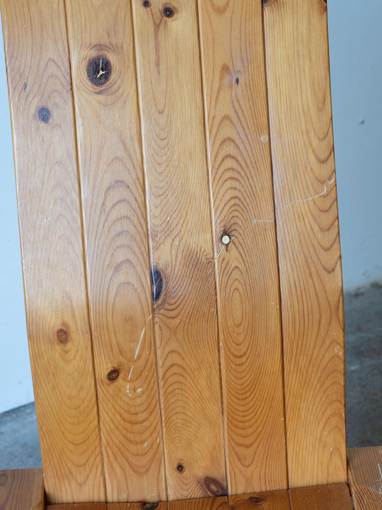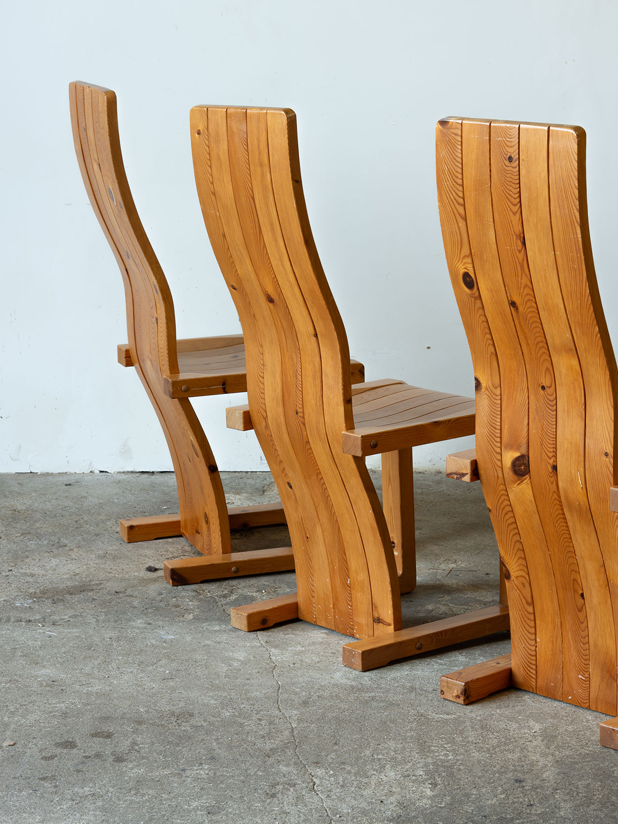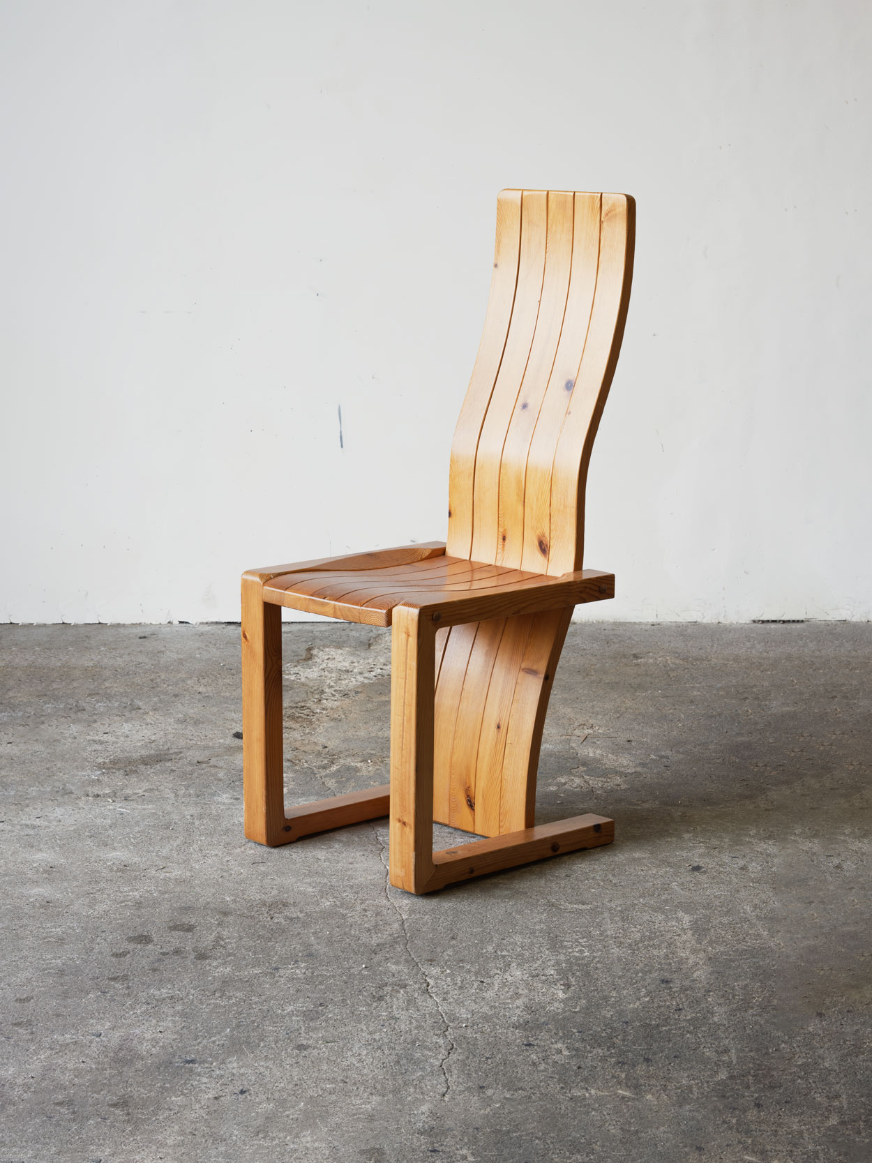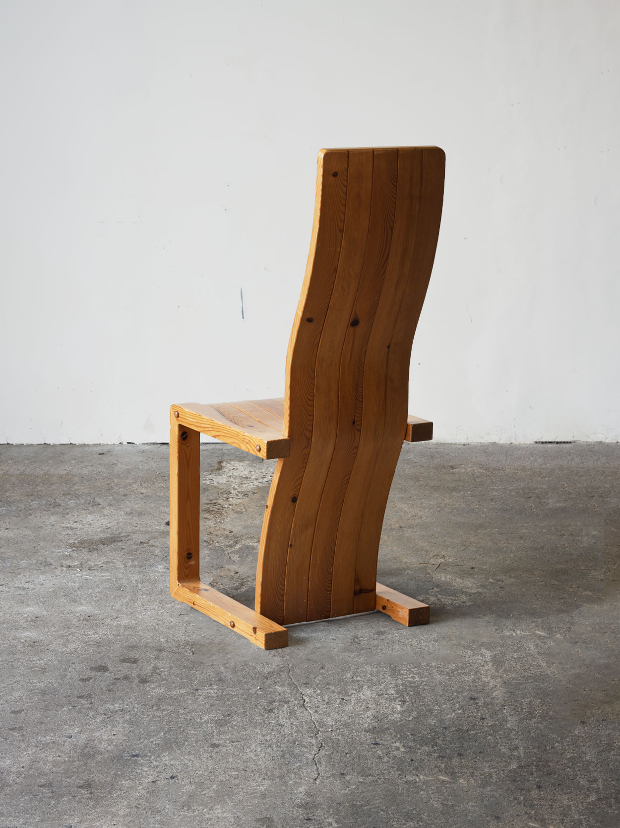 Krzesło z litej sosny w ciepłym kolorze, z falistym oparciem. Stan bardzo dobry, jeden egzemplarz z widoczna rysa…