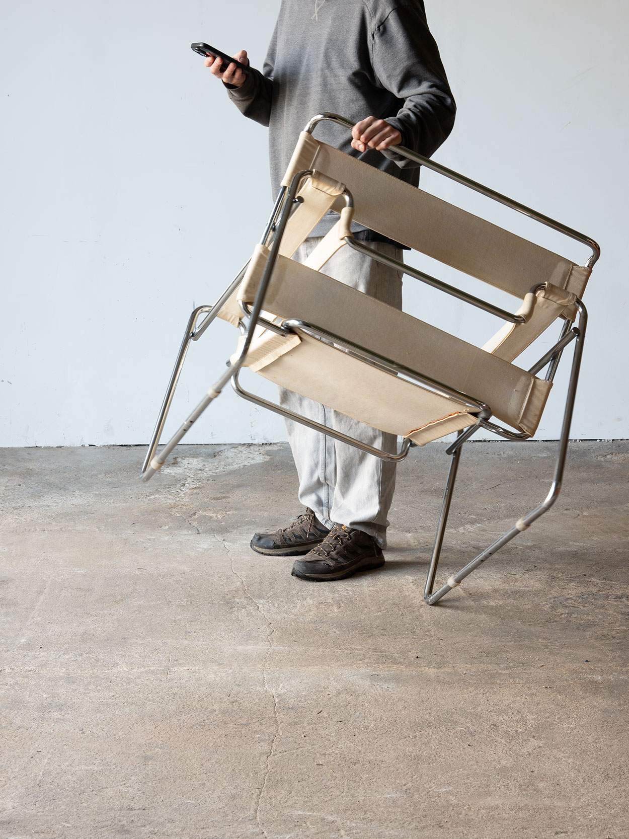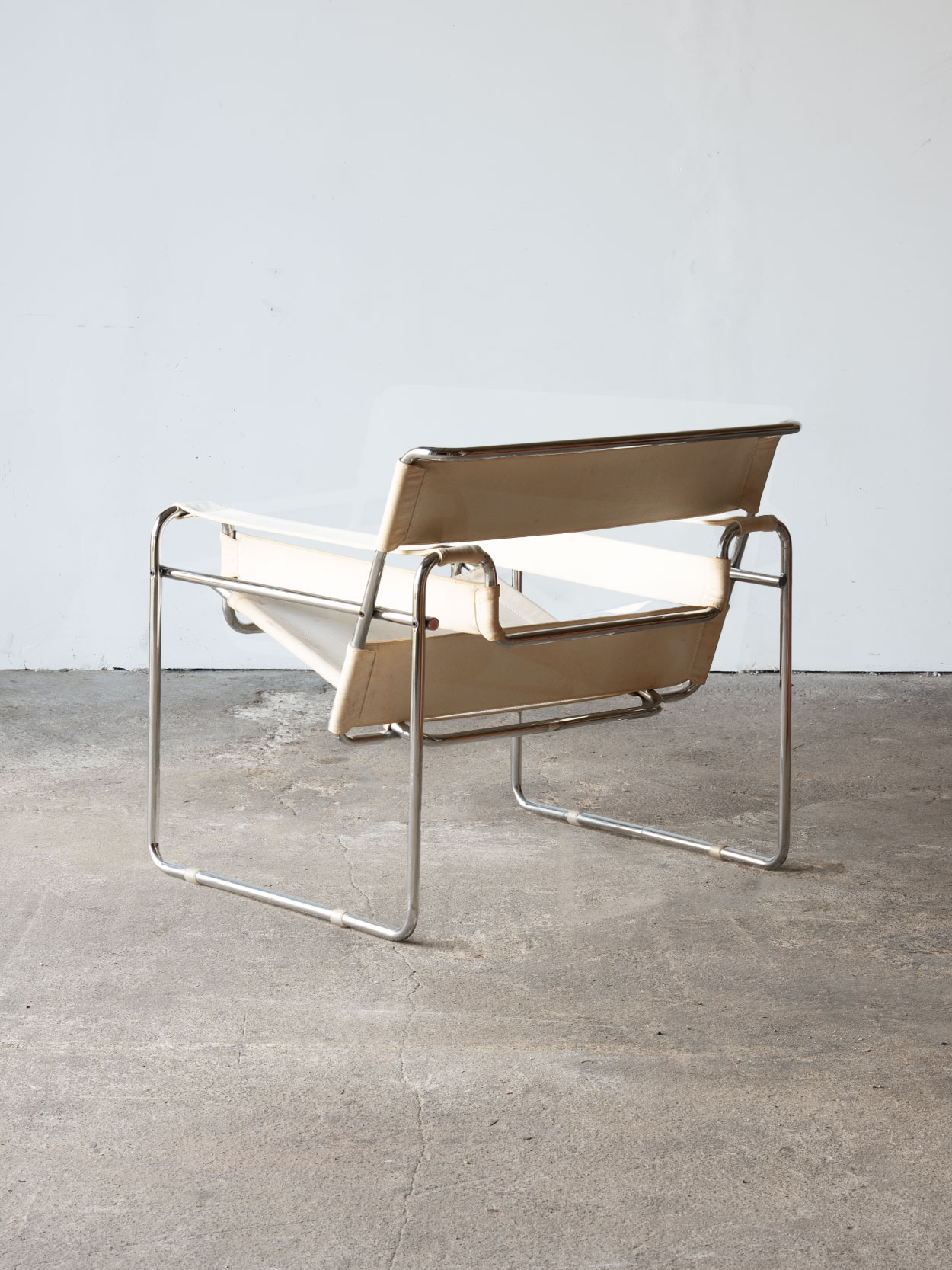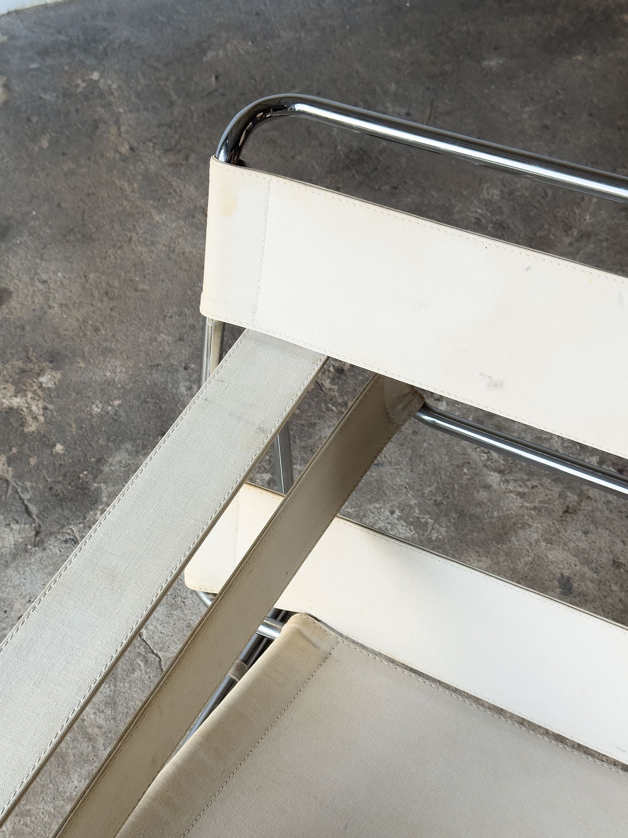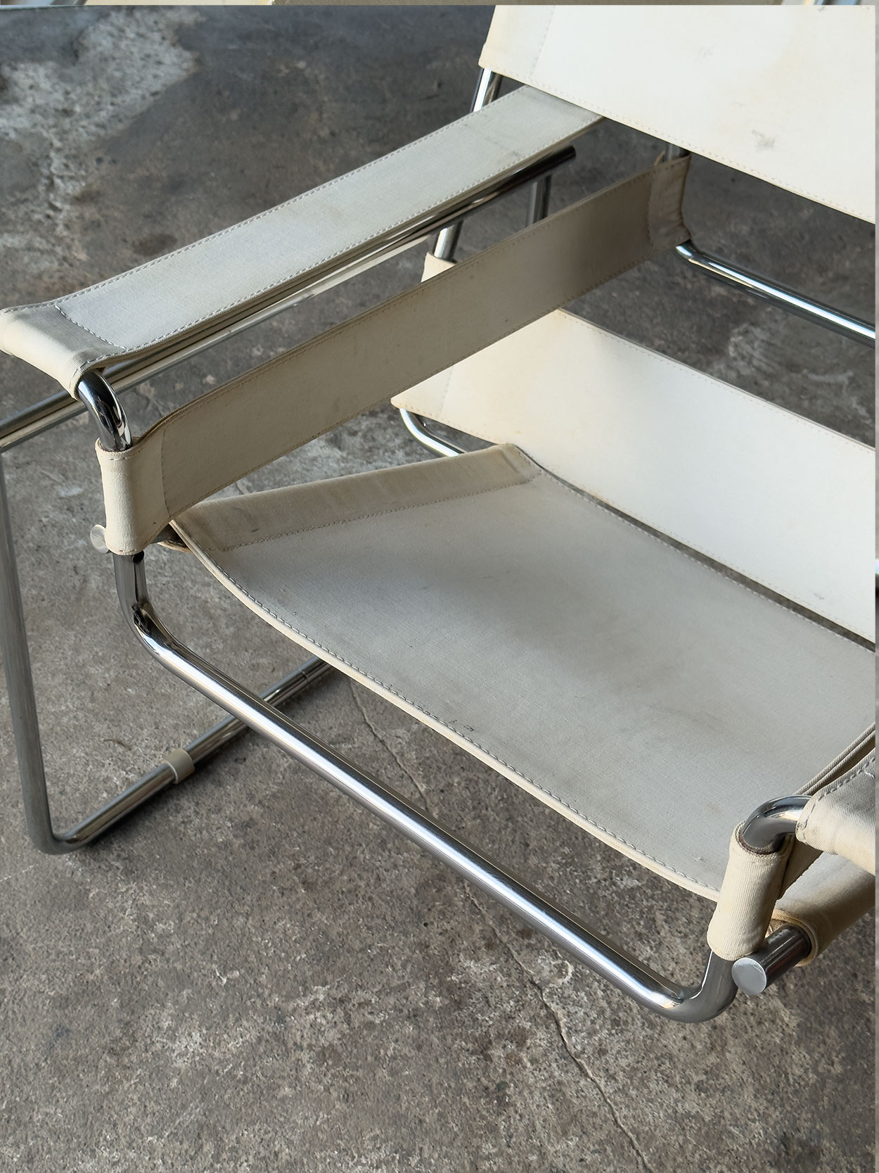 Prezentowany egzemplarz wyprodukowany przez włoską firmę Gavina, jednego z pierwszych producentów reedycji modernistycznych projektów Breuera przed przejęciem kolekcji przez Knoll. Tapicerka płócienna w kolorze jasnym, oryginalna. Na powierzchni widoczne punktowe plamy i ślady użytkowania. Rama stalowa w bardzo dobrym stanie, bez istotnych uszkodzeń mechanicznych.