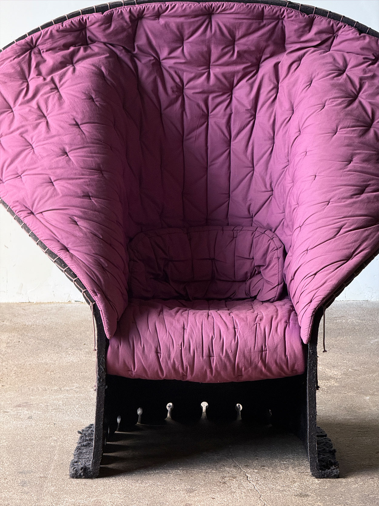 Egzemplarz to wysoka wersji fotela, wyróżniającej się rozłożystą formą i elastycznym oparciem. Korpus wykonano w całości z grubej, filcowanej wełny. Dolna część została usztywniona żywicą, natomiast górna pozostaje miękka, umożliwiając swobodne dostosowywanie oparcia przez użytkownika. Wnętrze wyłożono miękką, bawełnianą tapicerką w kolorze fioletowym, tworzącą swoisty kokon.