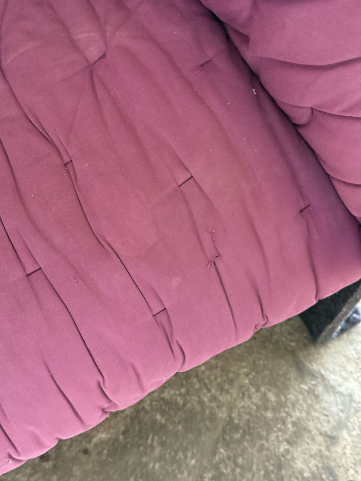 Oferowany egzemplarz zachowany jest w doskonałym stanie, na tapicerce jest niewielka dziurka która ma estetyczny szew w kolorze fioletowym.