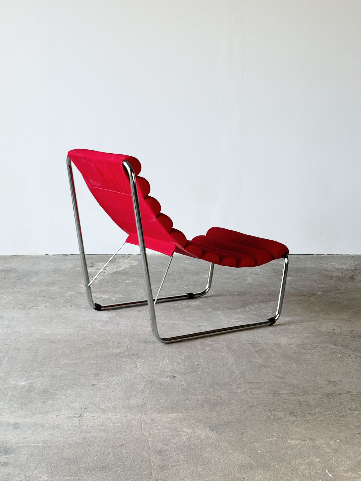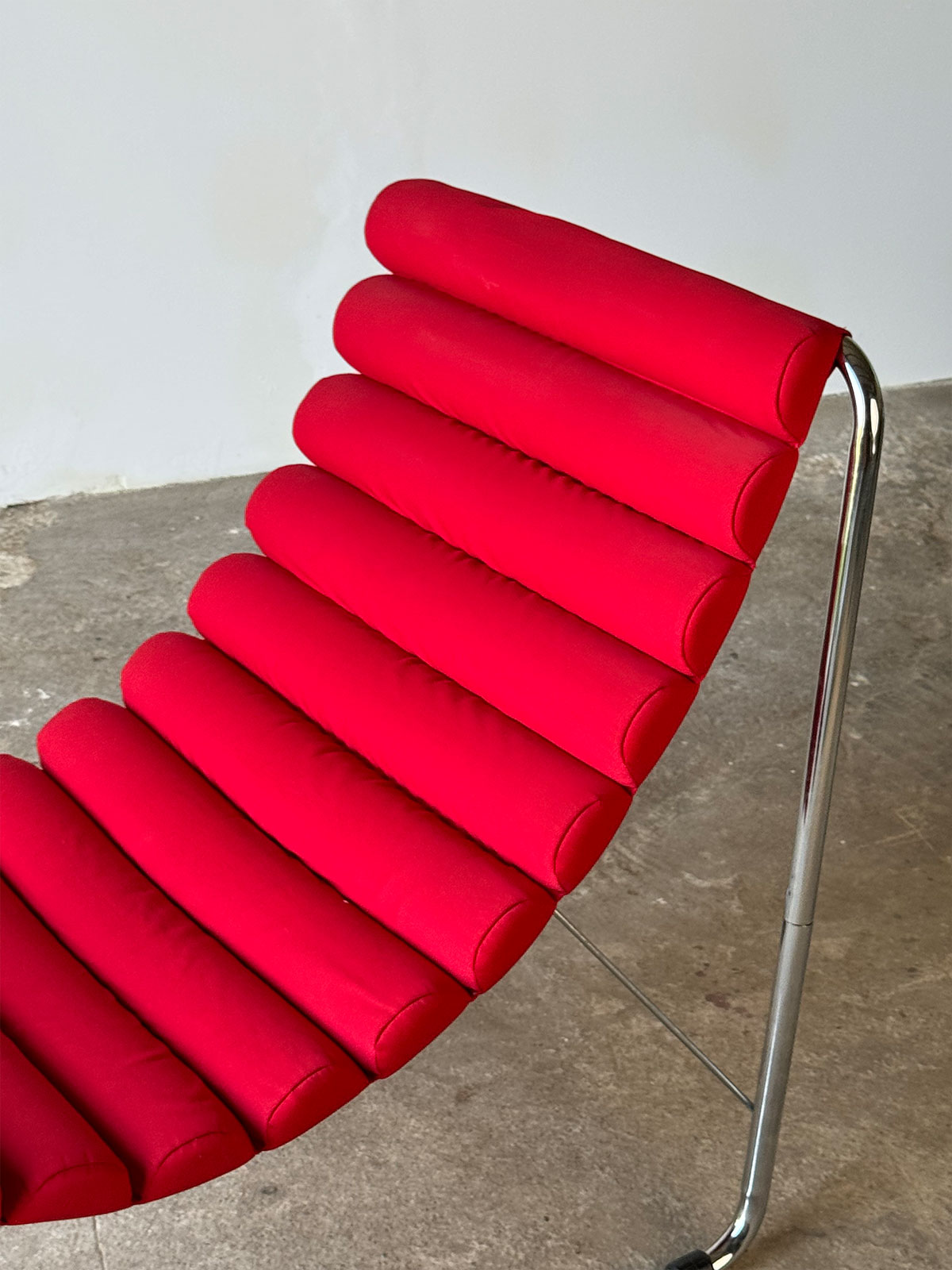 Chromowany fotel vintage inspirowany stylem Bauhaus, wykonany z giętej stalowej rurki i czerwonej tapicerki. Charakterystyczne poprzeczne wałki na…
