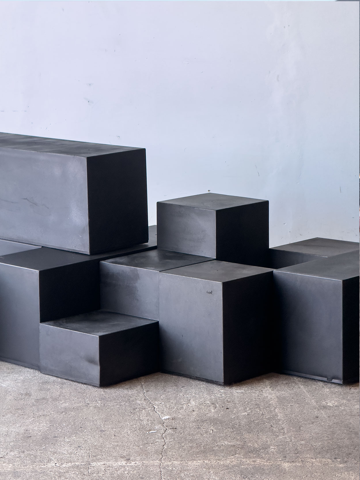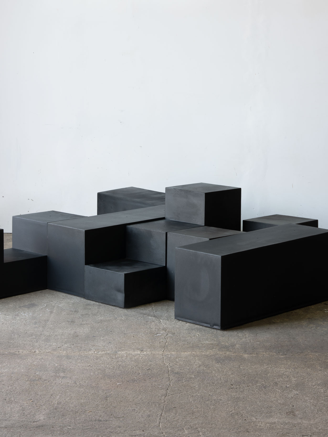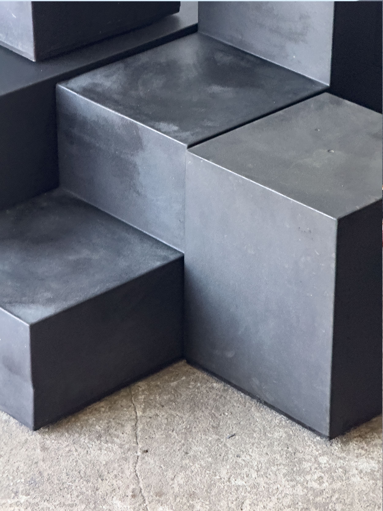 Bryły wykonane są z barwionego na czarno tworzywa syntetycznego – formowanej żywicy o matowej, lekko satynowej powierzchni. Materiał pozwolił na uzyskanie jednolitych, masywnych form o wyraźnie zdefiniowanych krawędziach. Konstrukcja zwarta, stabilna, wizualnie ciężka.