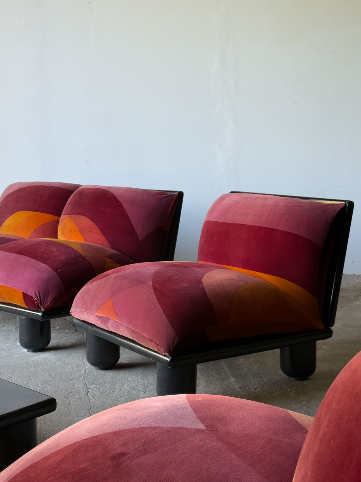 Zestaw salonowy w odcieniach czerwieni i pomarańczu, zachowany w bardzo dobrym stanie z niewielkimi śladami użytkowania. Oryginalna tapicerka i elementy konstrukcyjne. Sygnowany.