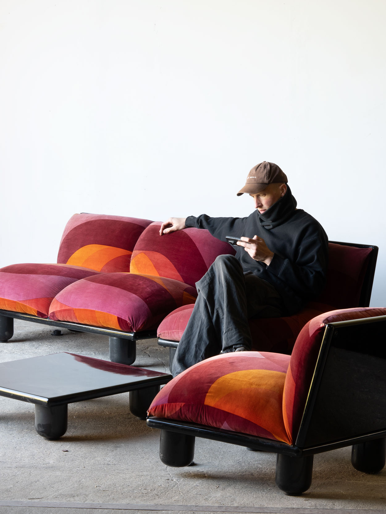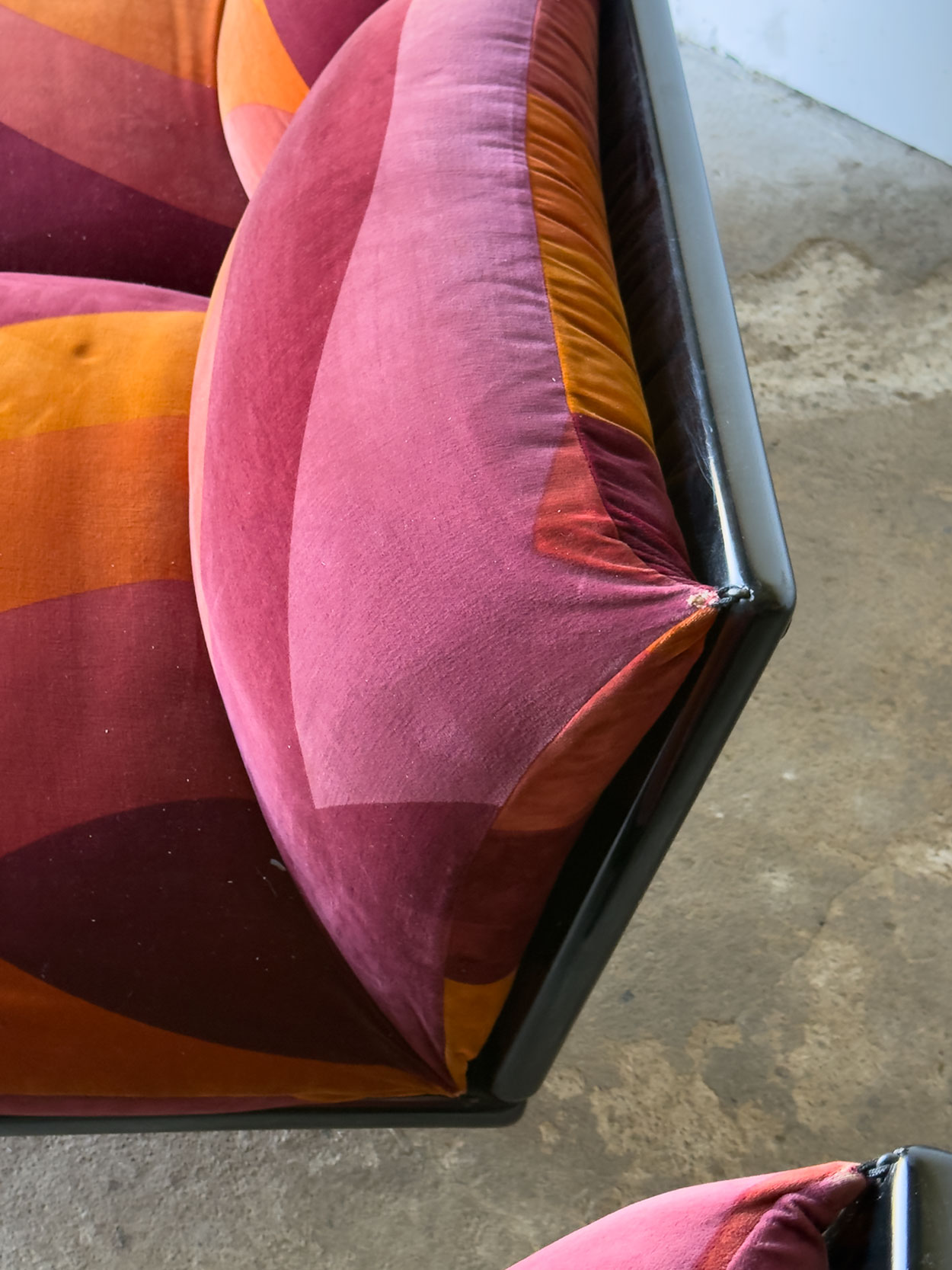 Bryły siedzisk są niskie i rozłożyste, o wyraźnie zaokrąglonych, poduszkowych kształtach. Tapicerka wykonana z drukowanego aksamitu bawełnianego o geometrycznym, falującym wzorze w odcieniach czerwieni, różu i pomarańczu. Konstrukcja oparta na wewnętrznym szkielecie ze sprężyn stalowych oraz formowanych wypełnieniach syntetycznych. Charakterystyczne, cylindryczne nogi wykonano z tworzywa (Moplen) z gumowymi podkładkami.