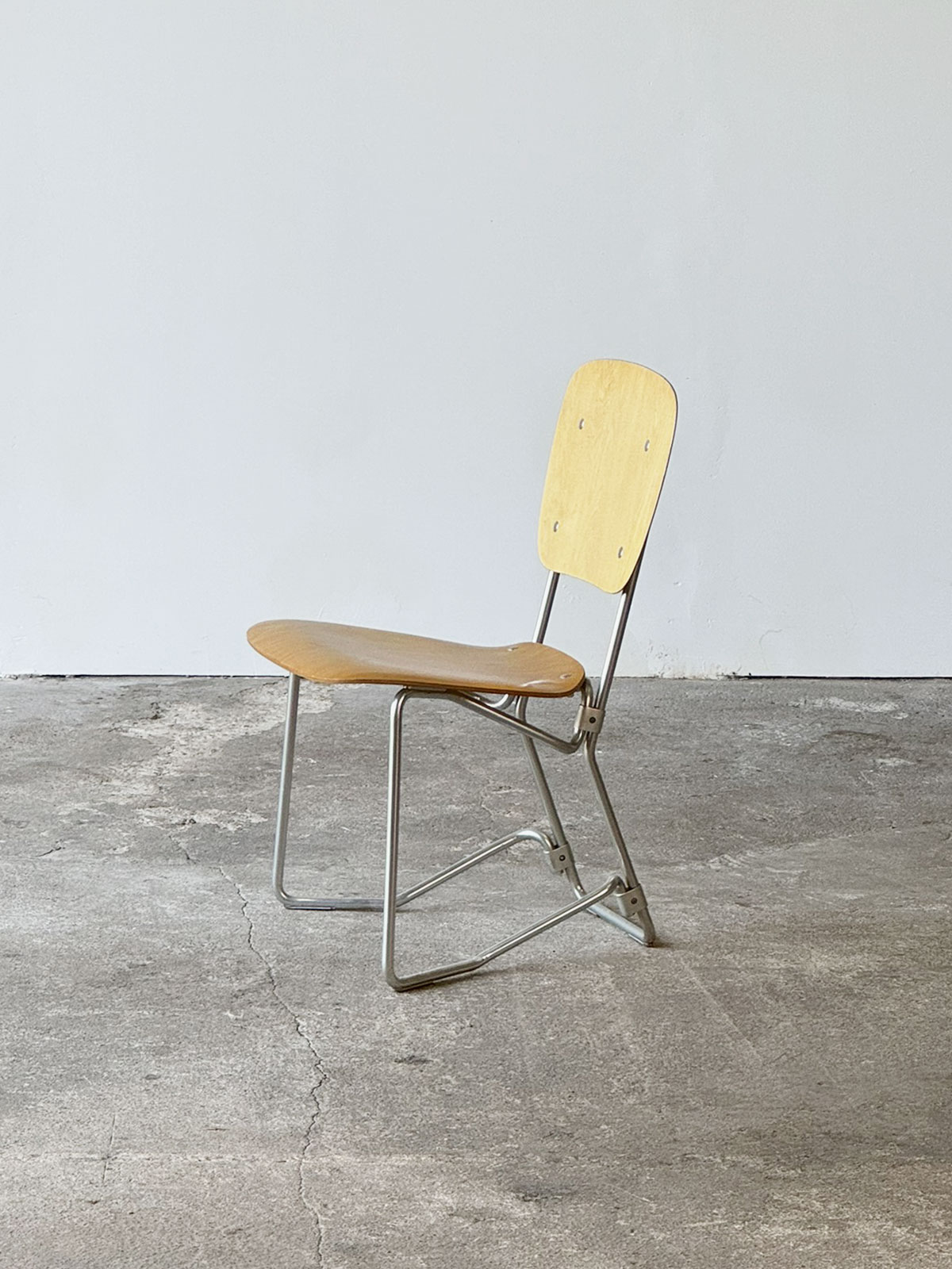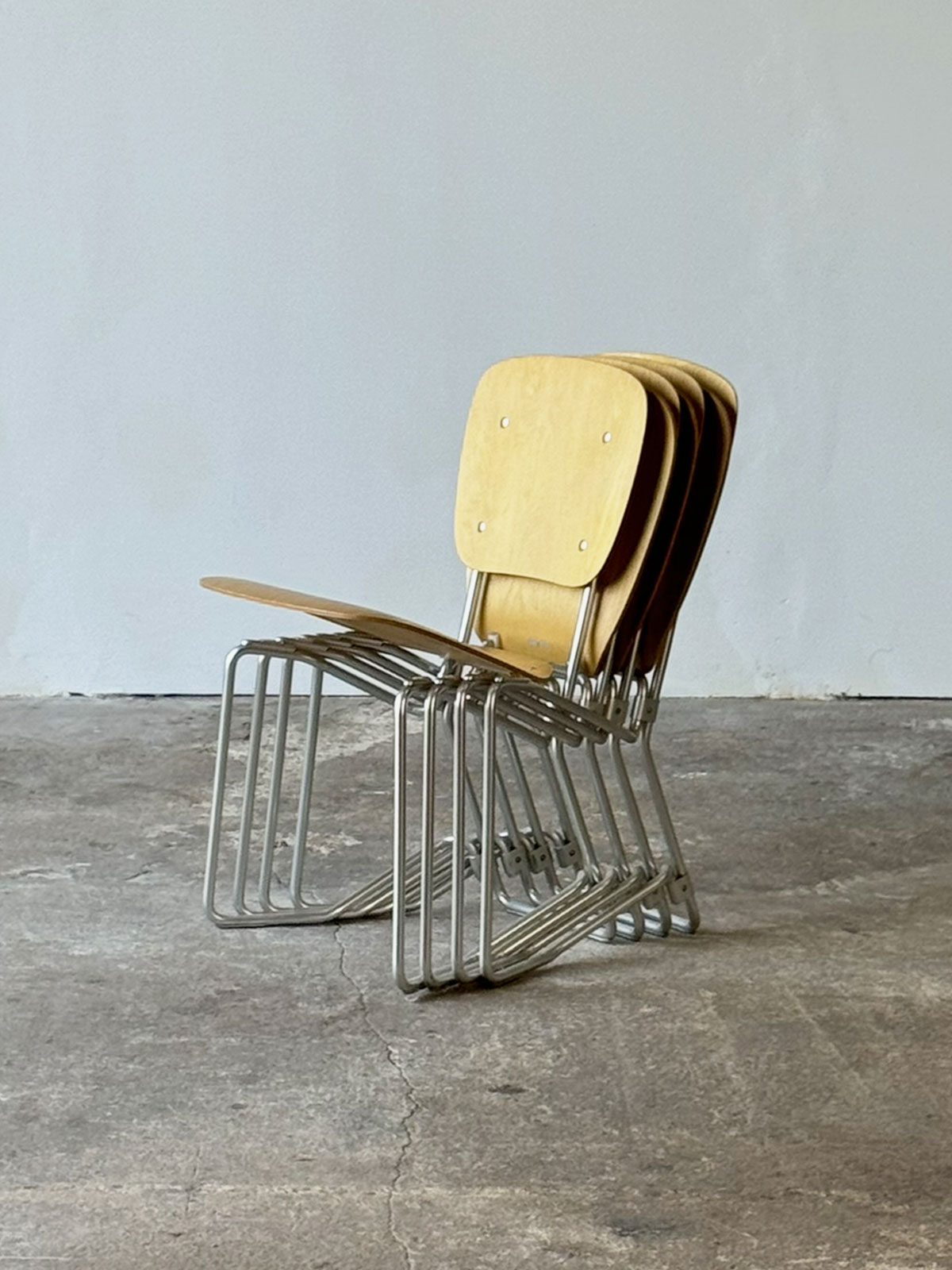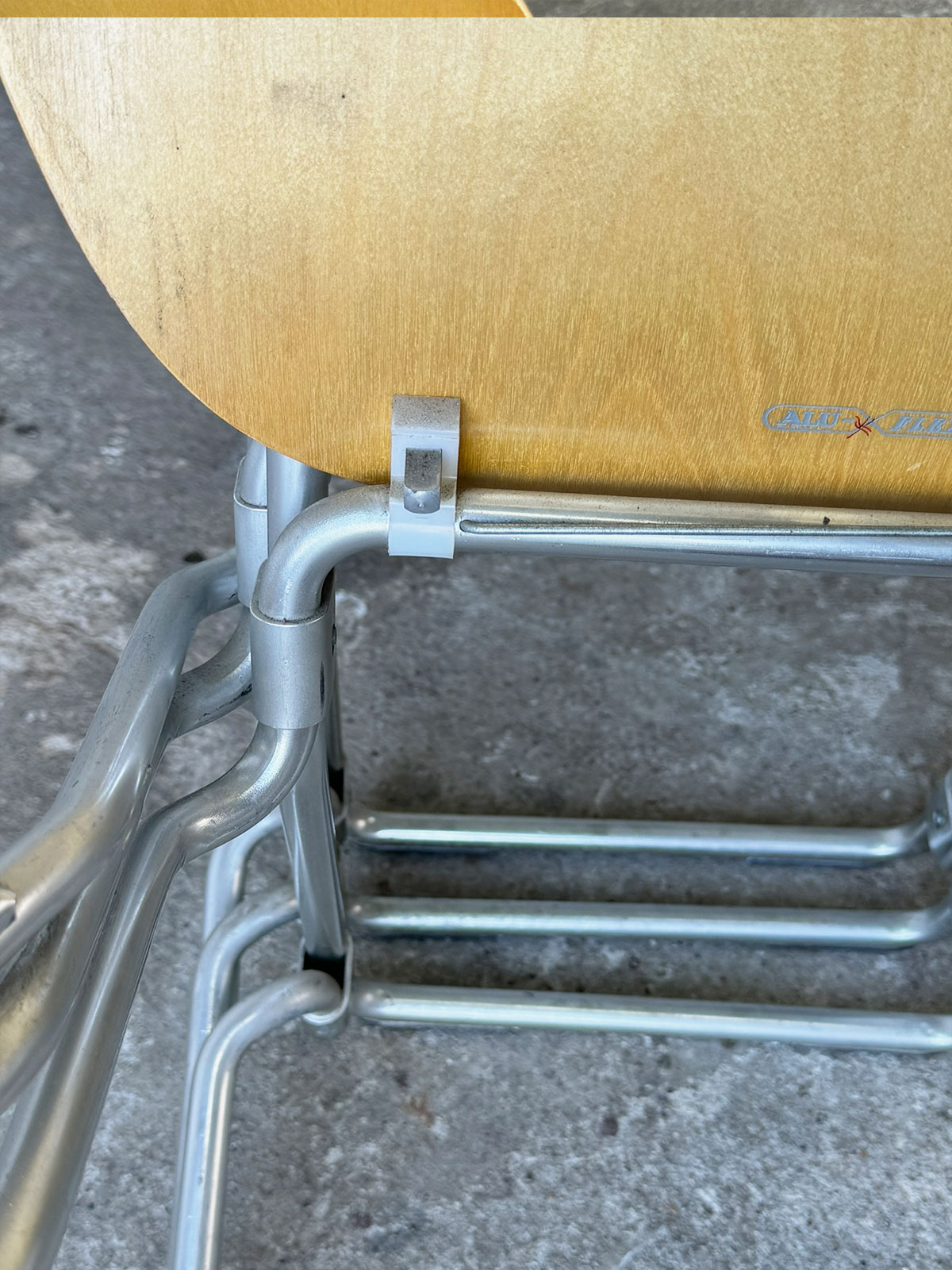 Krzesła Aluflex, projekt Armin Wirth, 1951, sygnowane, ultra lekkie (3 kg), sztaplowane, z aluminiowymi nogami i bukową sklejką. Oparcie dostosowuje się do ciała użytkownika, zapewniając wysoki komfort. To nieco niższa wersja, siedzisko jest na wysokości 38,5 cm.