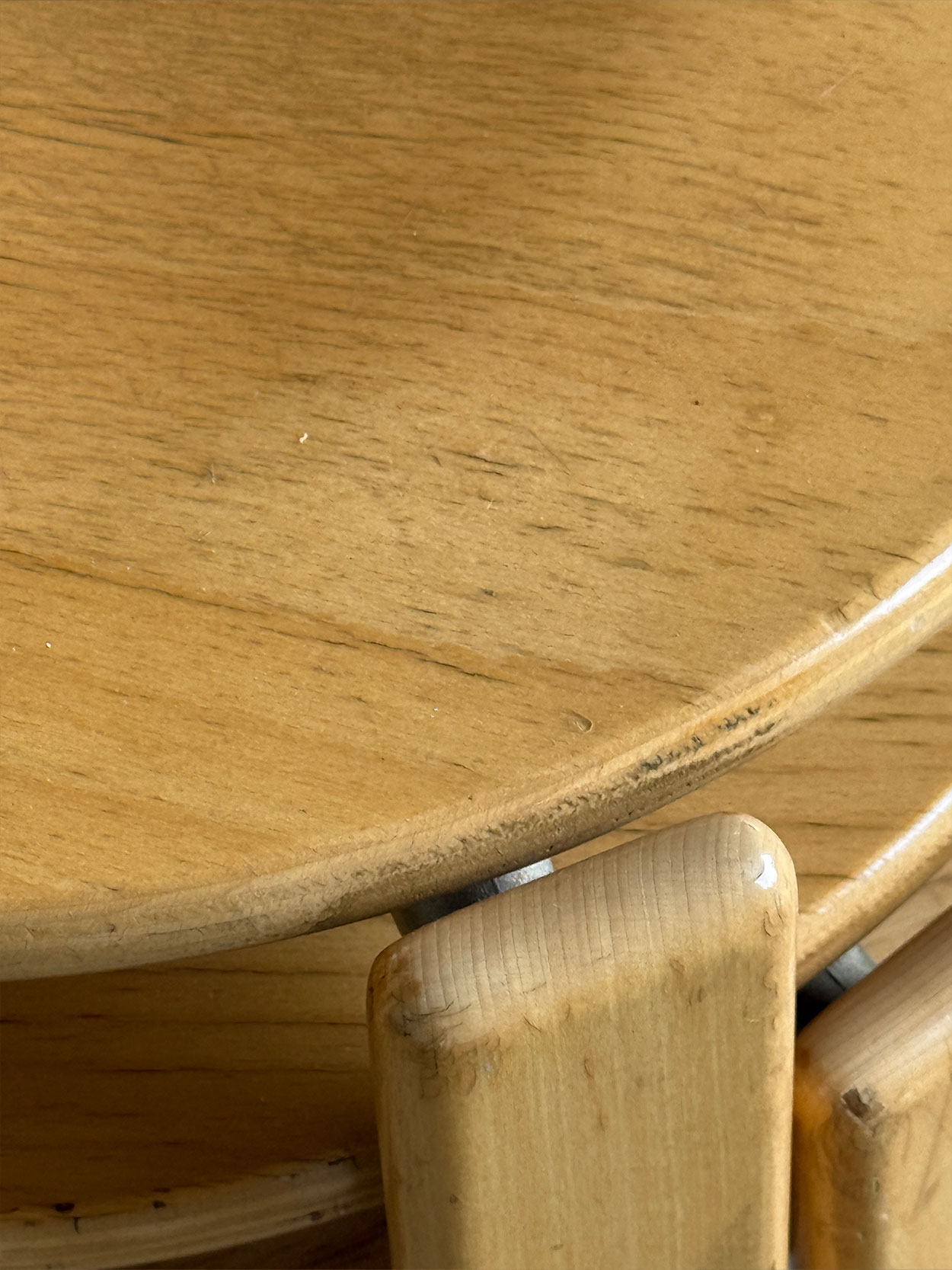 Krzesło ma wyraźne ślady użytkowania w postaci rys i przetarć na lakierze, nadaje się do użytku bez renowacji, jednak nie wygląda jak zupełnie nowe.
