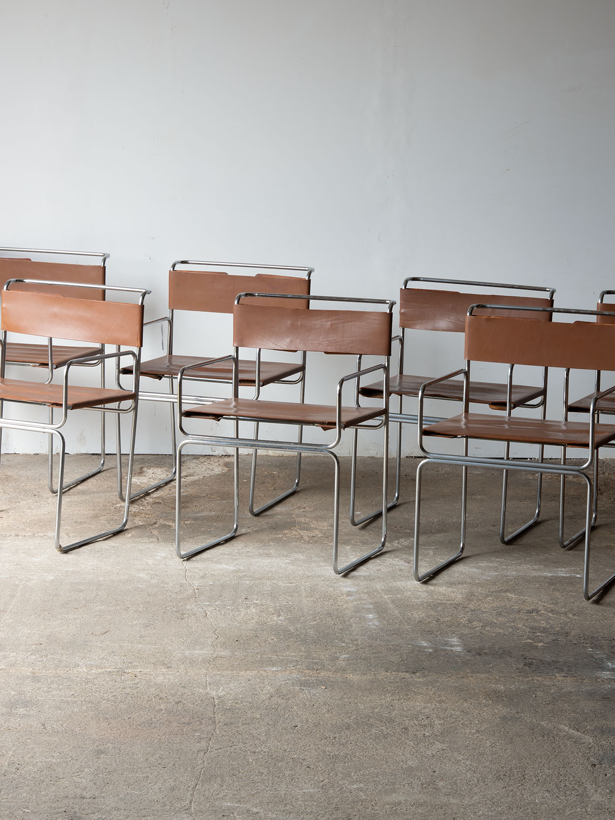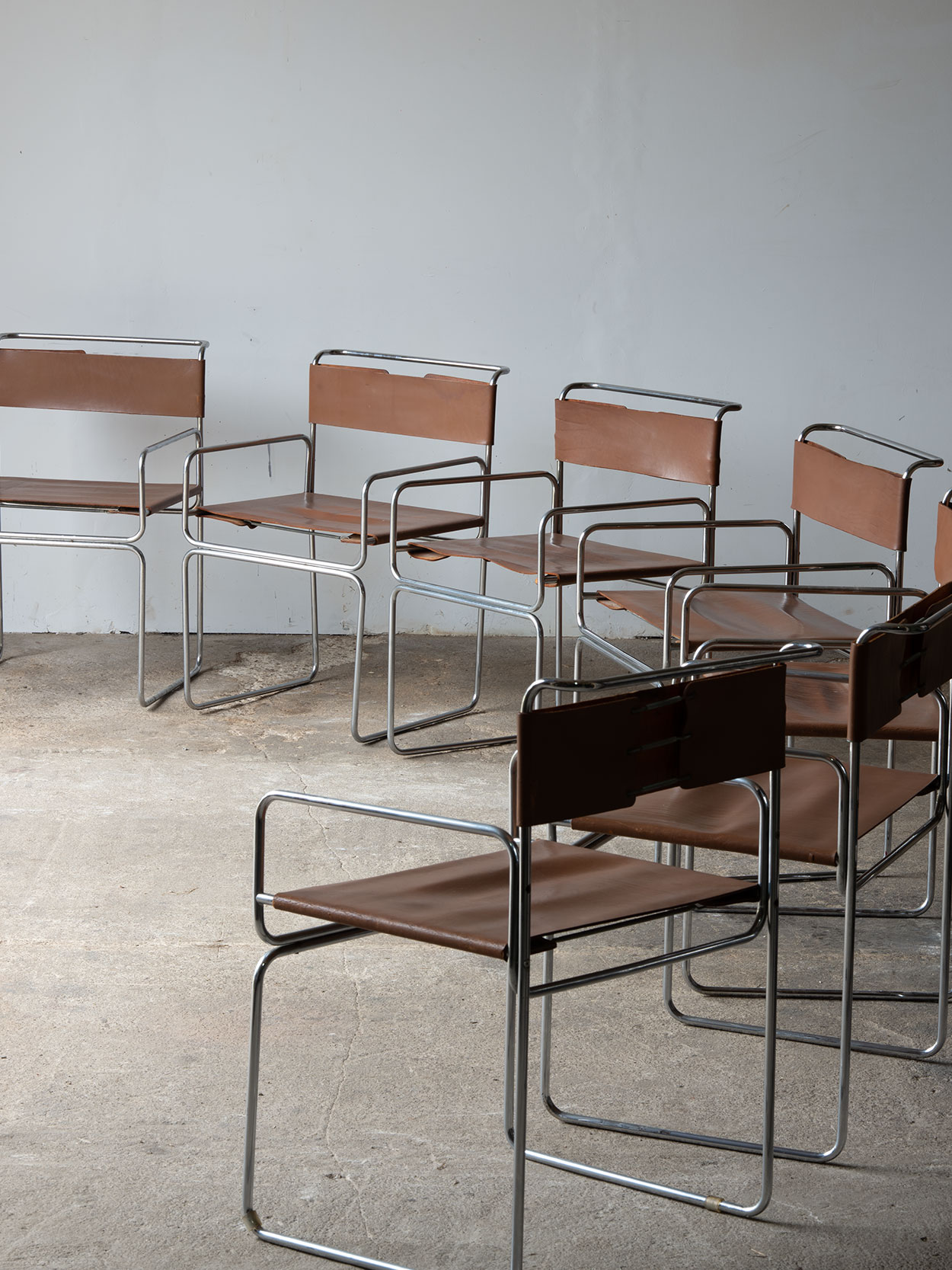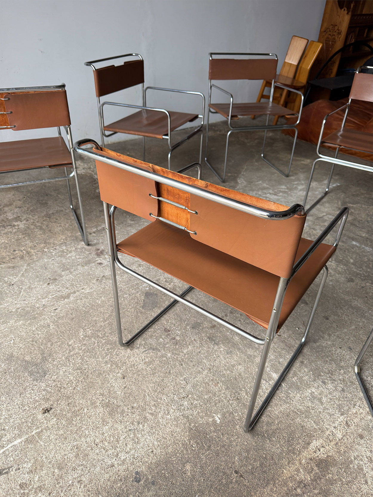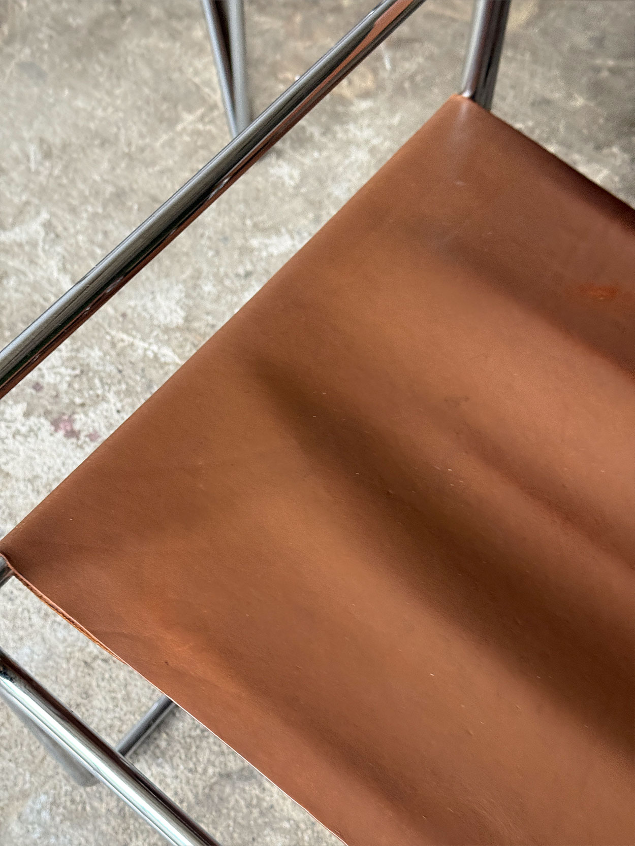 Stan zachowania dobry. Chromowana konstrukcja zachowana jest w dobrym stanie, z typowymi śladami użytkowania. Skóra posiada przetarcia i przebarwienia wynikające z wieku, bez uszkodzeń strukturalnych. Całość zachowuje pełną funkcjonalność i oryginalny charakter.