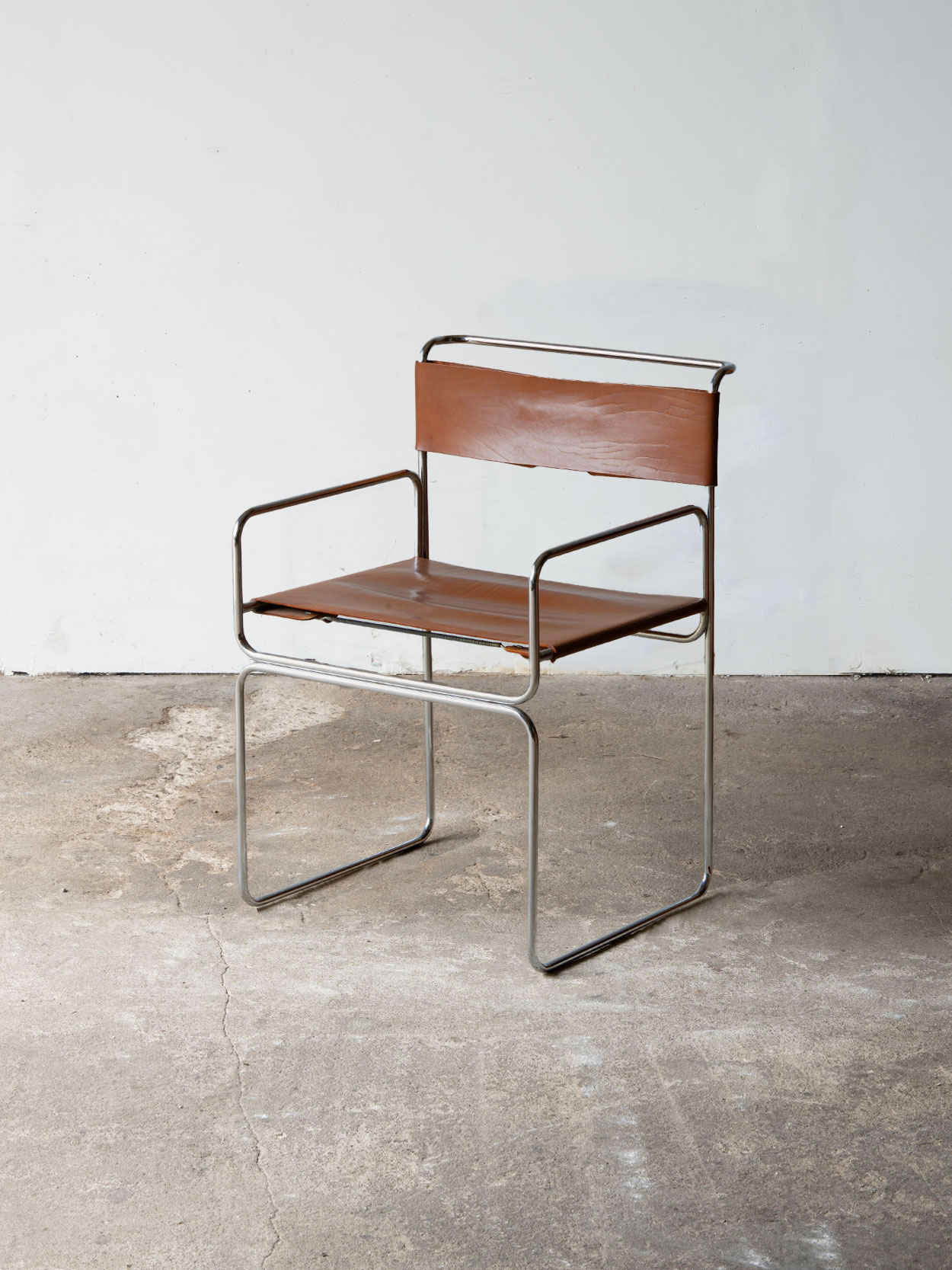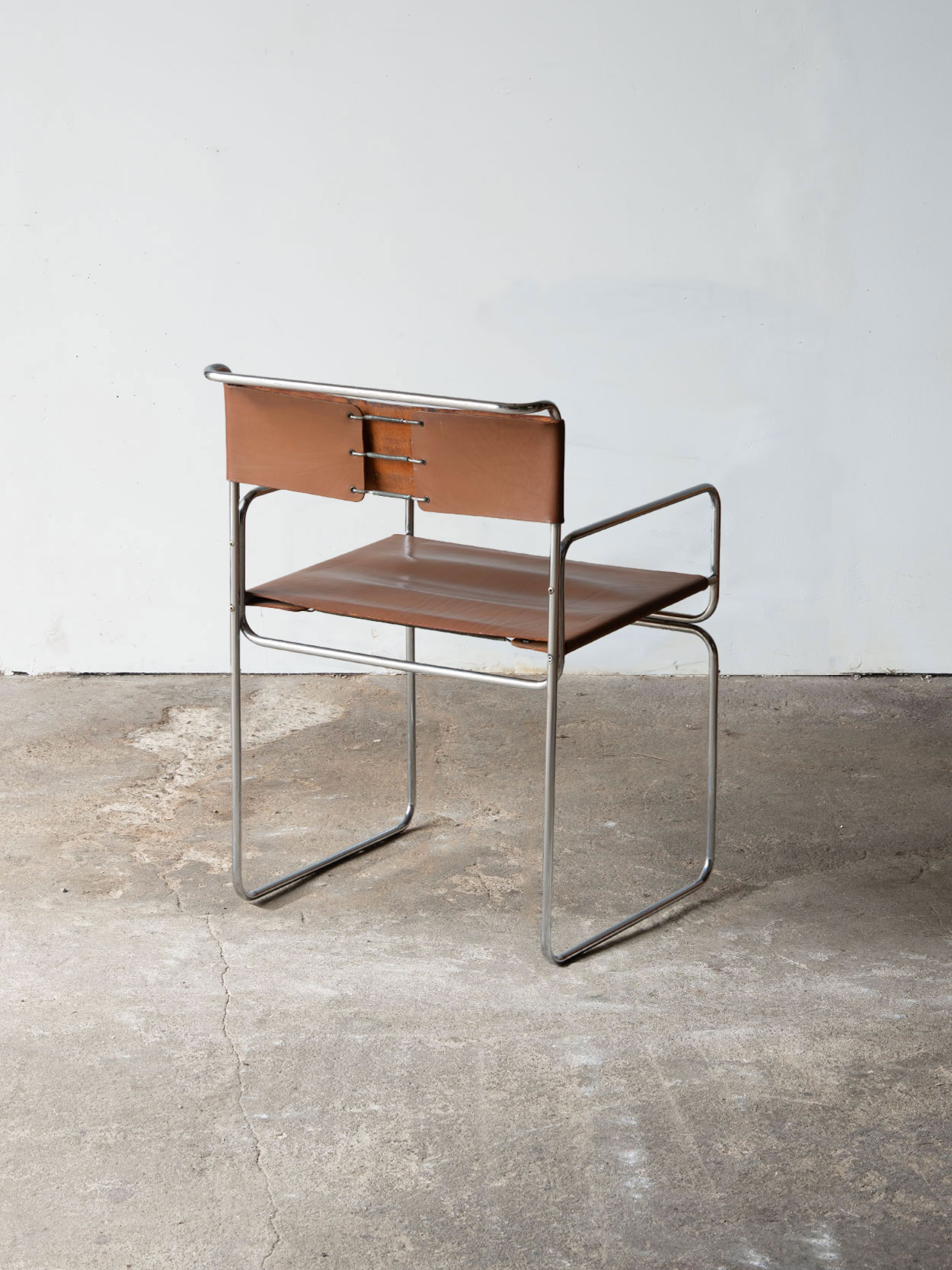 Konstrukcja wykonana jest z giętej, chromowanej stali. Stelaż tworzy ciągłą linię obejmującą nogi, podłokietniki i oparcie. Siedzisko oraz oparcie wykonano z grubej, naturalnej skóry barwionej na brązowy kolor. Skóra jest napięta na sprężynach, co zapewnia elastyczność i komfort użytkowania bez dodatkowych wypełnień.