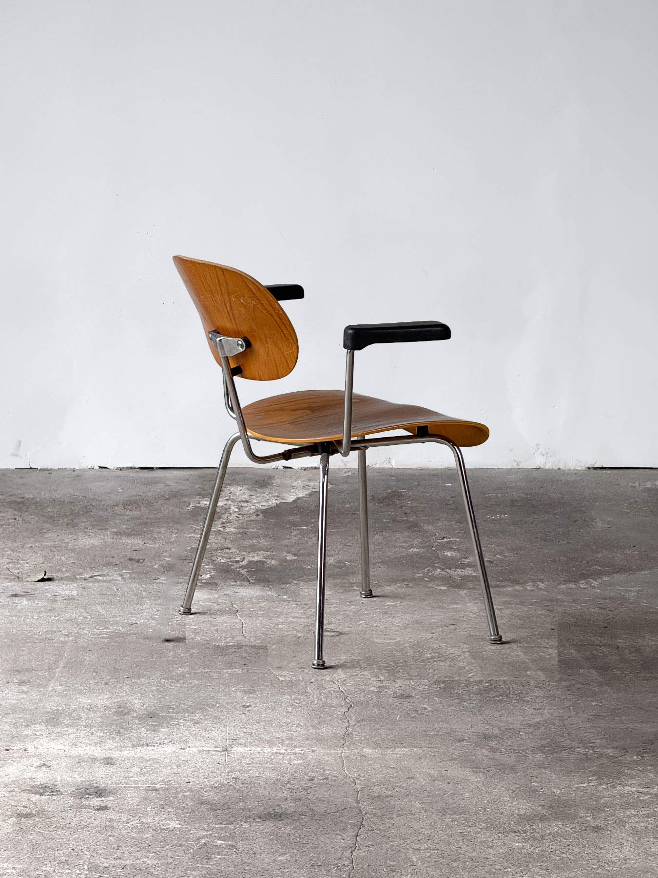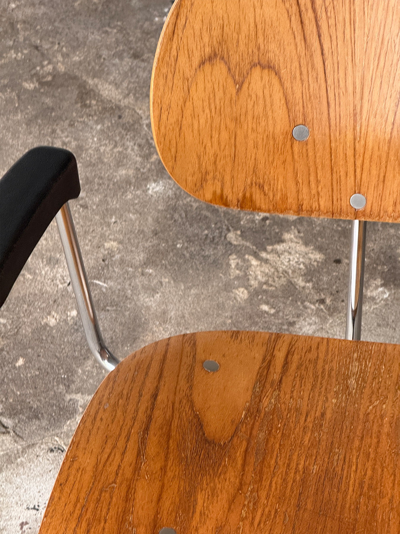 Siedzisko krzesła wykonane jest z giętej sklejki w naturalnym wybarwieniu, co nadaje mu lekkości i organicznego charakteru. Konstrukcja z chromowanej stali jest solidna i odporna na uszkodzenia, zaś podłokietniki wykonane z wygodnej gumy. Krzesło jest w dobrym stanie vintage – na powierzchni lakieru widoczne są estetyczne przetarcia, charakterystyczne dla upływu czasu i nadające meblowi autentyczności. Stan mechaniczny krzesła jest bardzo dobry, a jego stabilność i komfort pozostają na wysokim poziomie. Mebel sygnowany oryginalną nalepką producenta.