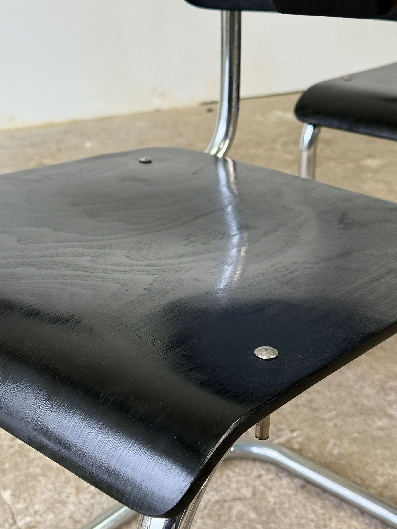 Krzesła musieliśmy niestety odnowić. Mają nowy lakier, który zakrywa niewielkie, trwałe wady na sklejce. Stalowa konstrukcja zachowana w stanie oryginalnym, posiada kilka mniejszych lub większych odprysków powłoki. Stan wizualny jest bardzo dobry, stan mechaniczny również.