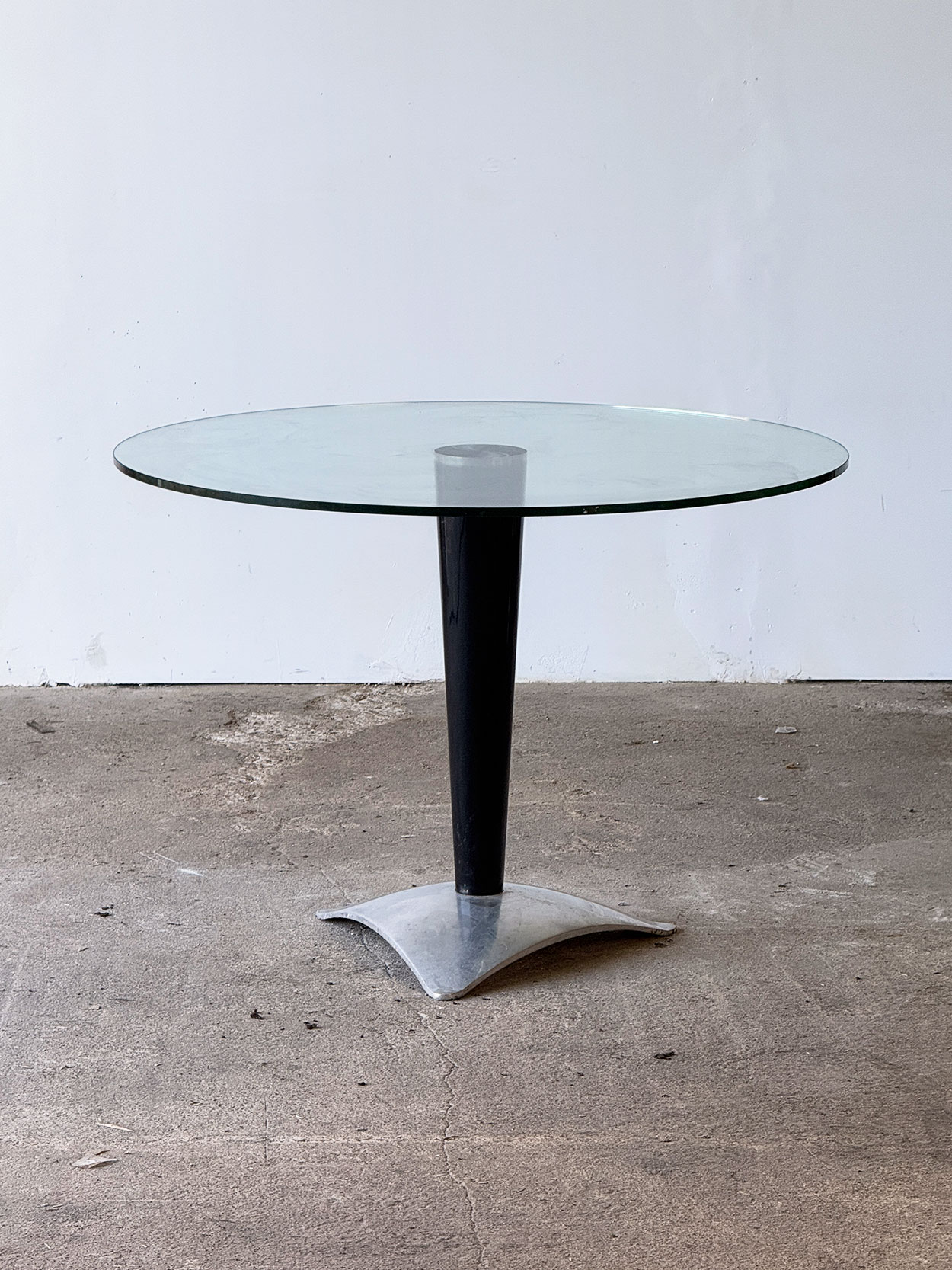 Stół vintage z okrągłym blatem ze szkła hartowanego o średnicy 120 cm. Konstrukcja wsparta na jednej stalowej nodze, malowanej na czarno, zakończonej dekoracyjną podstawą w…