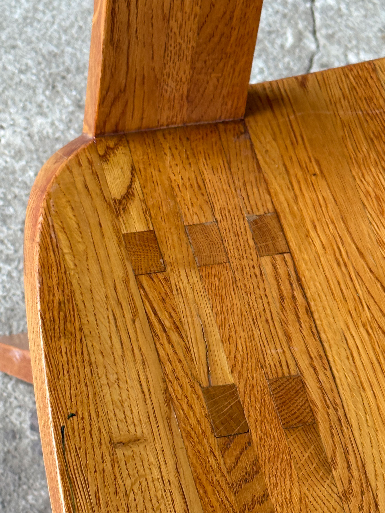 Krzesła sprzedawane w naszym sklepie wykonane są z drewna dębowego, to używane meble vintage, posiadają niewielkie ślady użytowania w postaci rys i przetarć. Można obejrzeć je w Warszawie, możliwa jest również wysyłka w dowolne miejsce w Polsce i Europie.