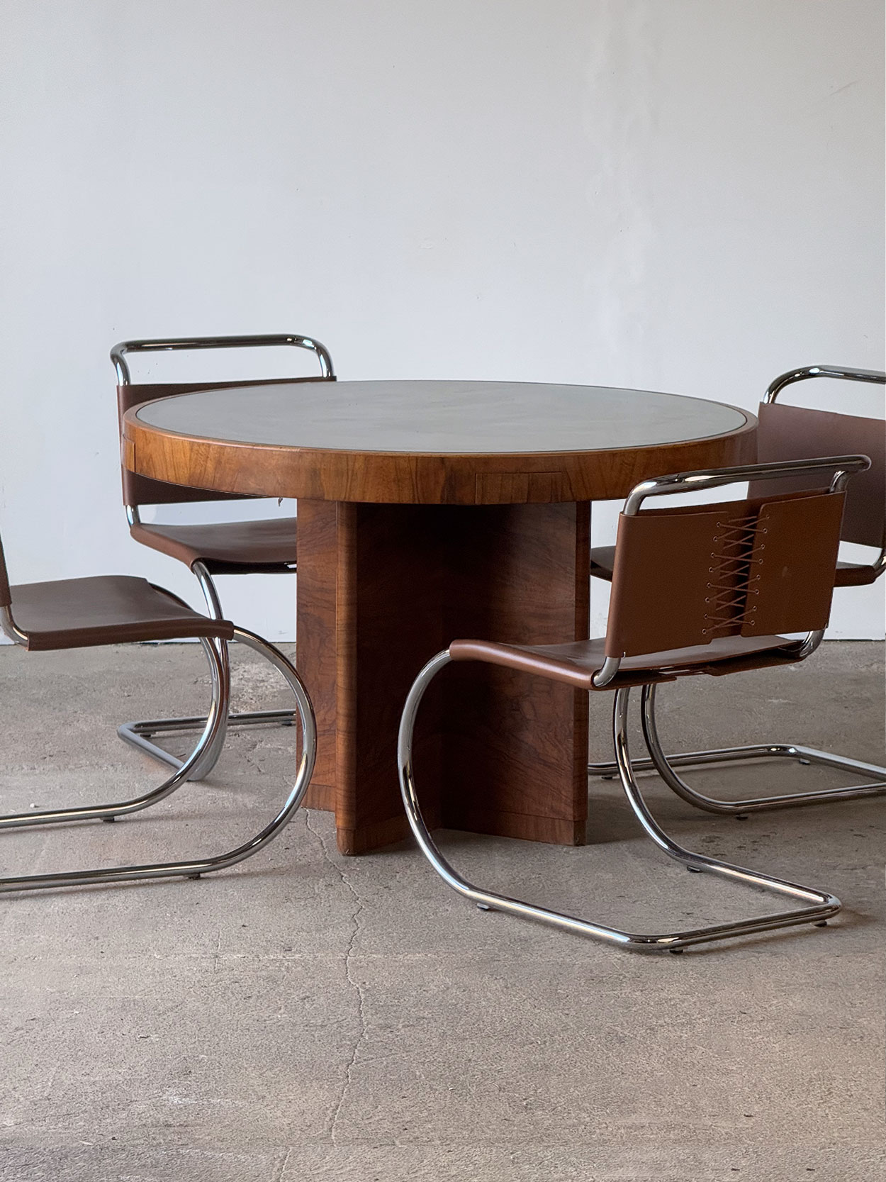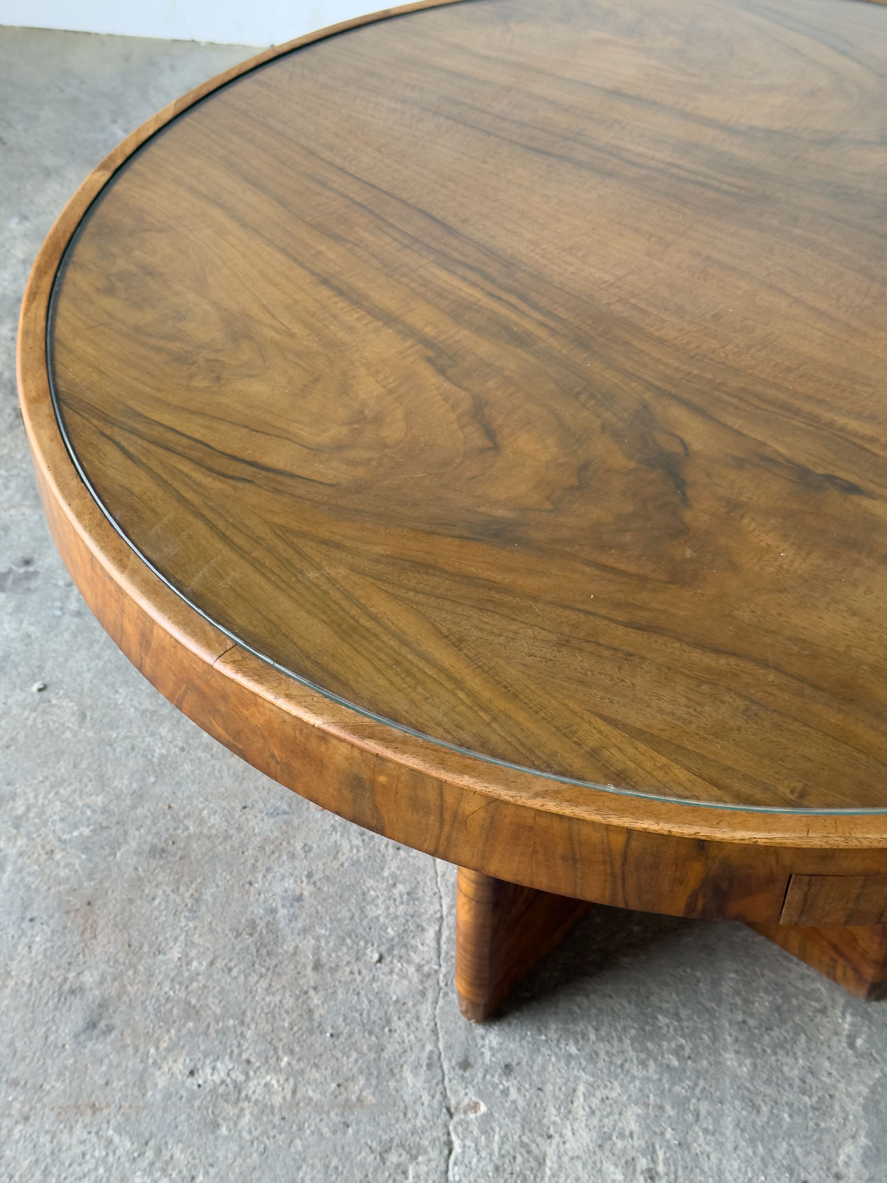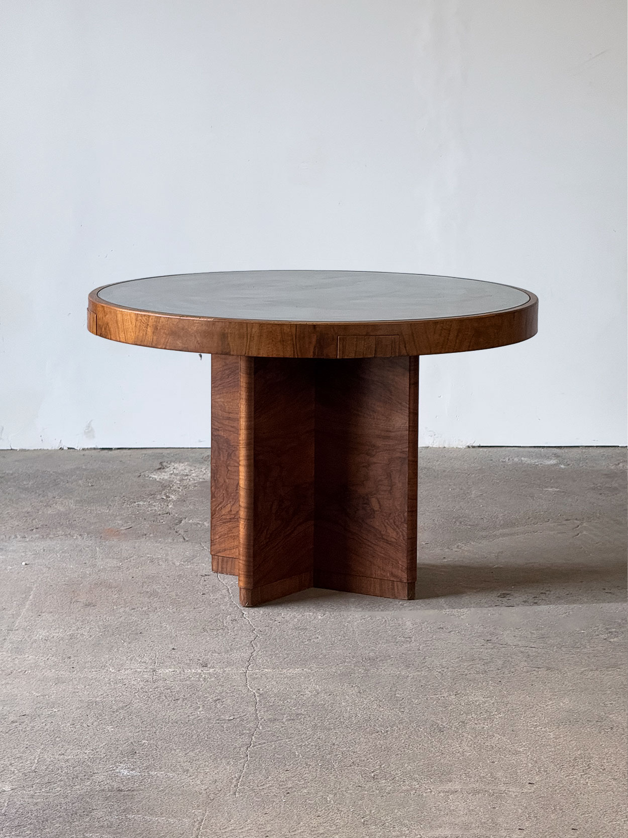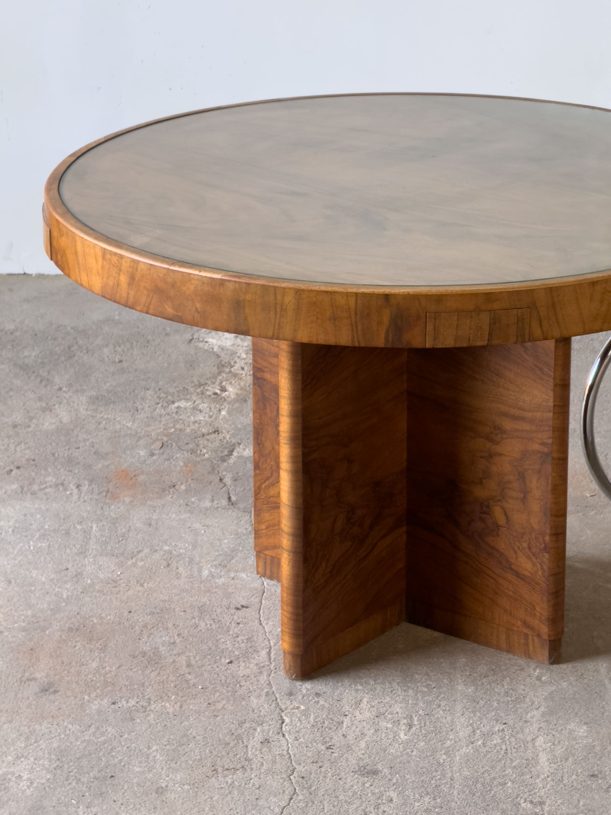 Secesyjny okrągły stół z lat 20.–30., fornirowany orzechem, z czterema szufladkami i blatem zabezpieczonym szkłem. Prosta, geometryczna forma…