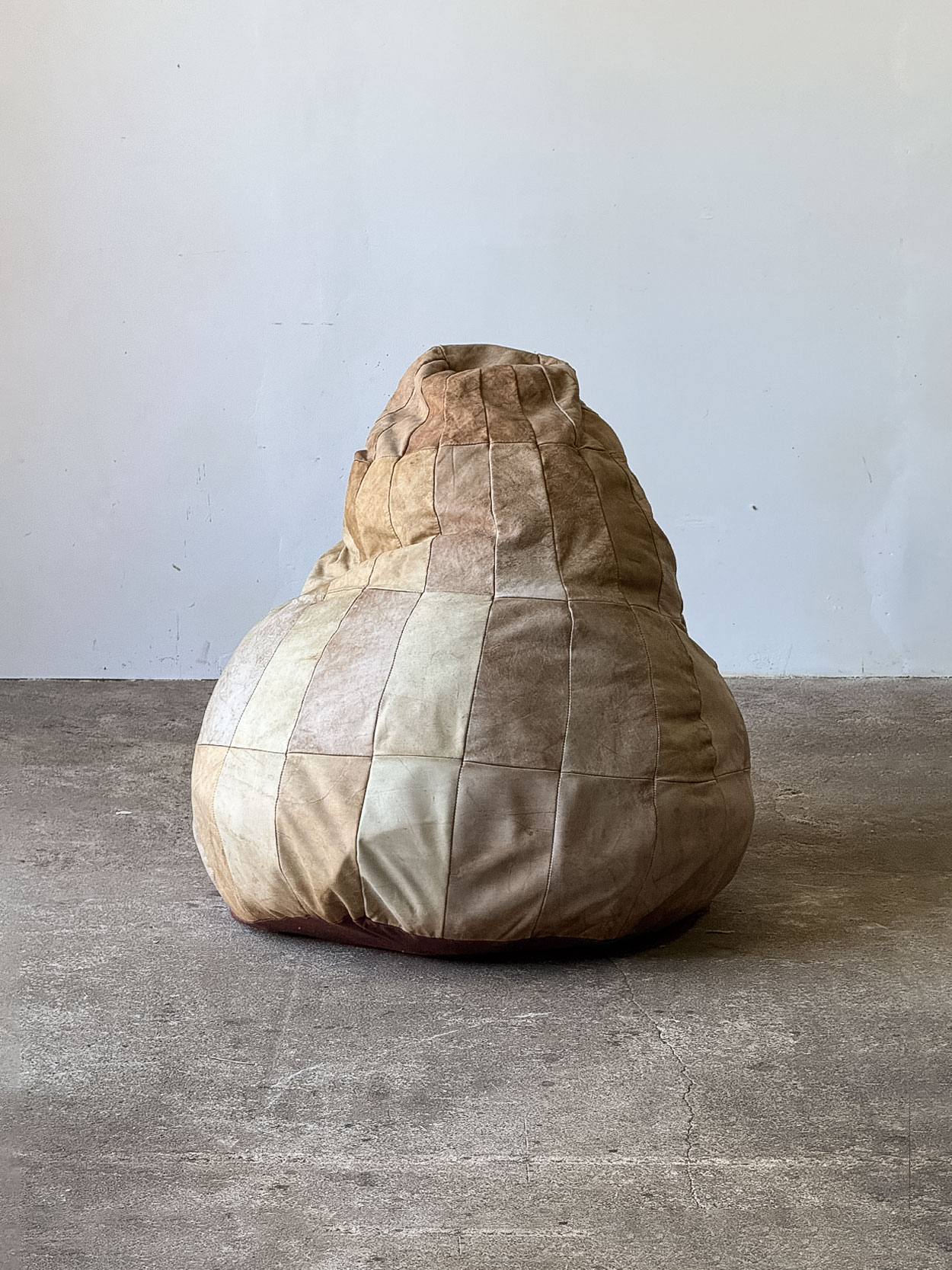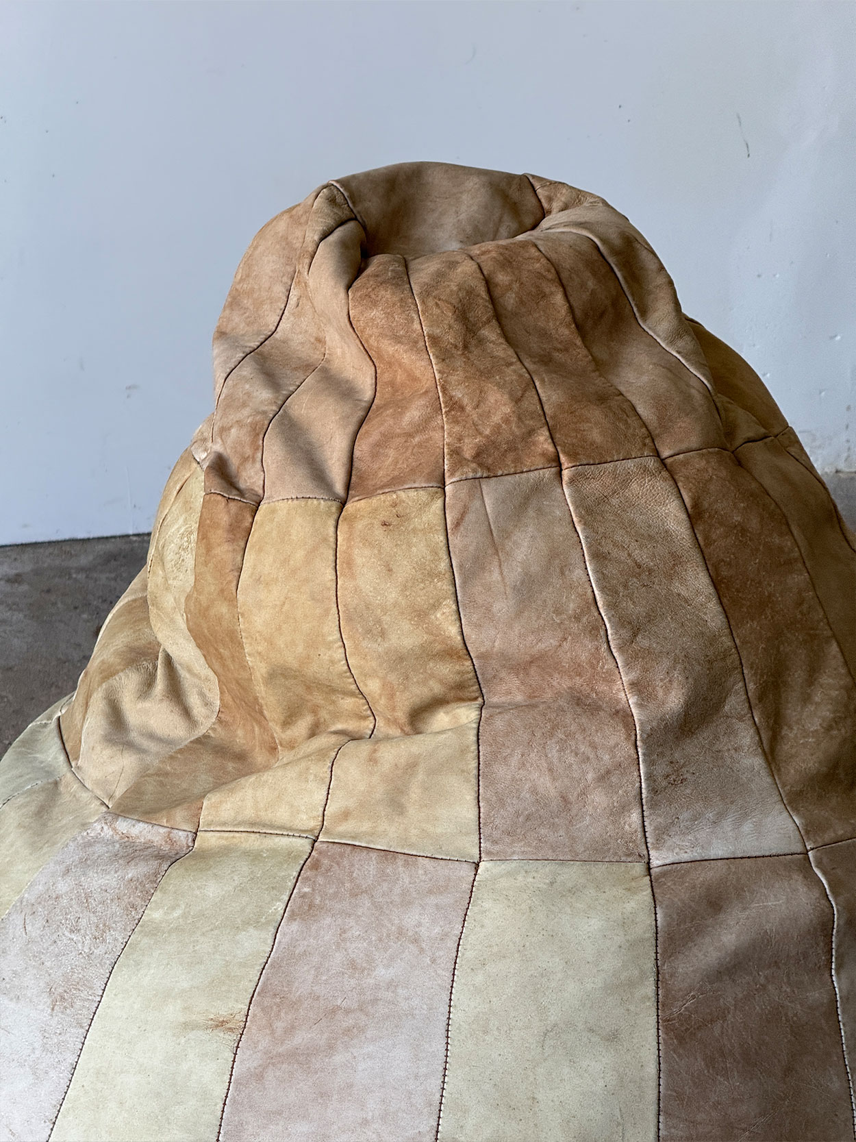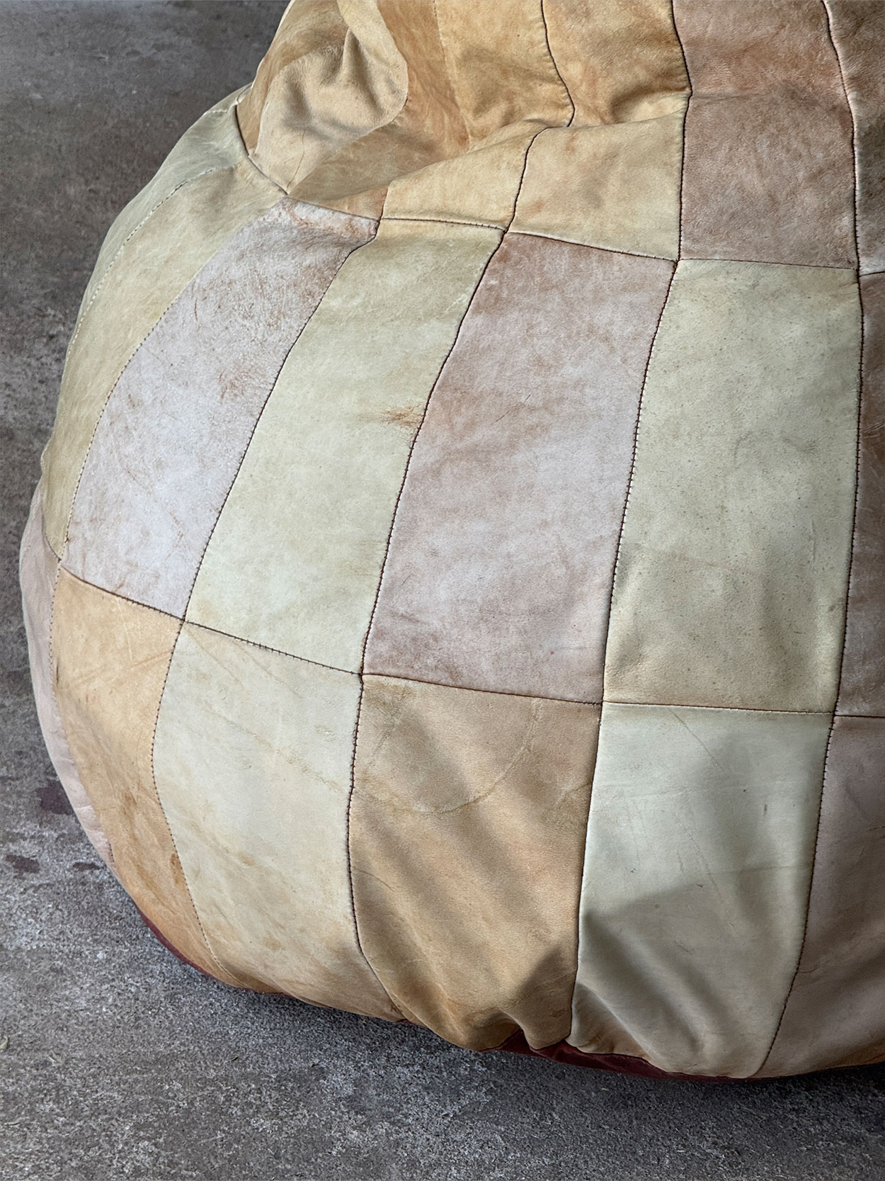 Duża pufa wyprodukowana przez szwajcarską firmę De Sede, znaną z wysokiej jakości rzemiosła i charakterystycznego patchworkowego wykończenia ze skóry.