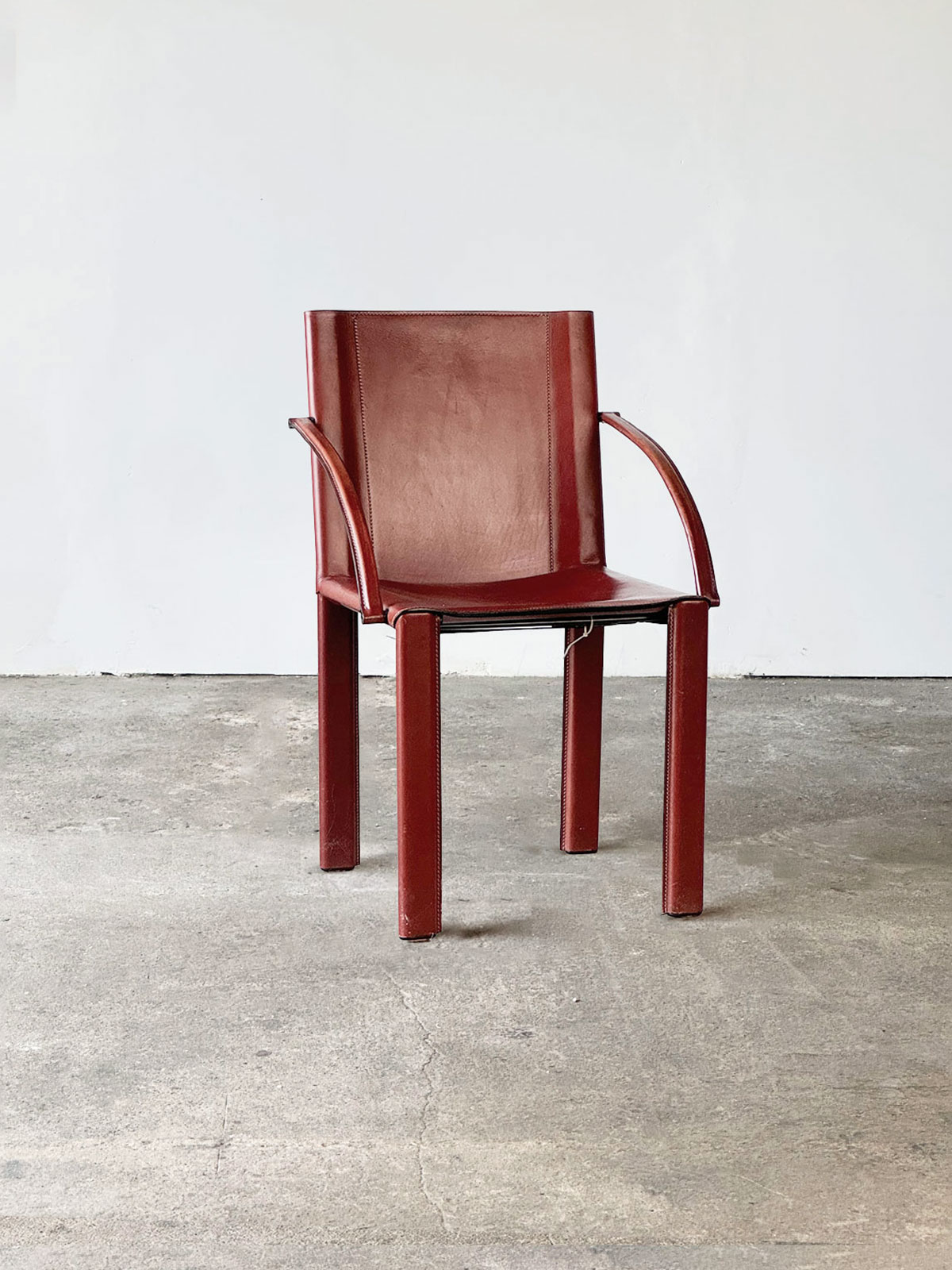 Krzesła CR1B z serii Carol, zaprojektowane przez Carlo Bartoliego, wyprodukowane przez renomowaną włoską firmę Matteo Grassi. Pokryte bordową, naturalną skórą typu saddle leather, w tym nogi i podłokietniki. Sygnowane logiem producenta. Doskonały stan, niewielkie ślady użytkowania. Postmodernistyczny projekt z lat 80.