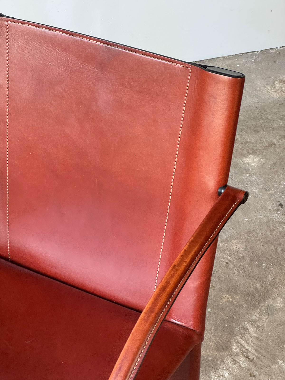 Krzesła te zostały wykonane ze stalowego stelaży pokrytego najwyższej jakości naturalną skórą siodłową wybarwionej na elegancki bordowy kolor. Zarówno siedzisko, oparcie, a także nogi i podłokietniki są w całości pokryte tą twardą skórą, co nadaje im trwałości, elegancji i ekskluzywności.