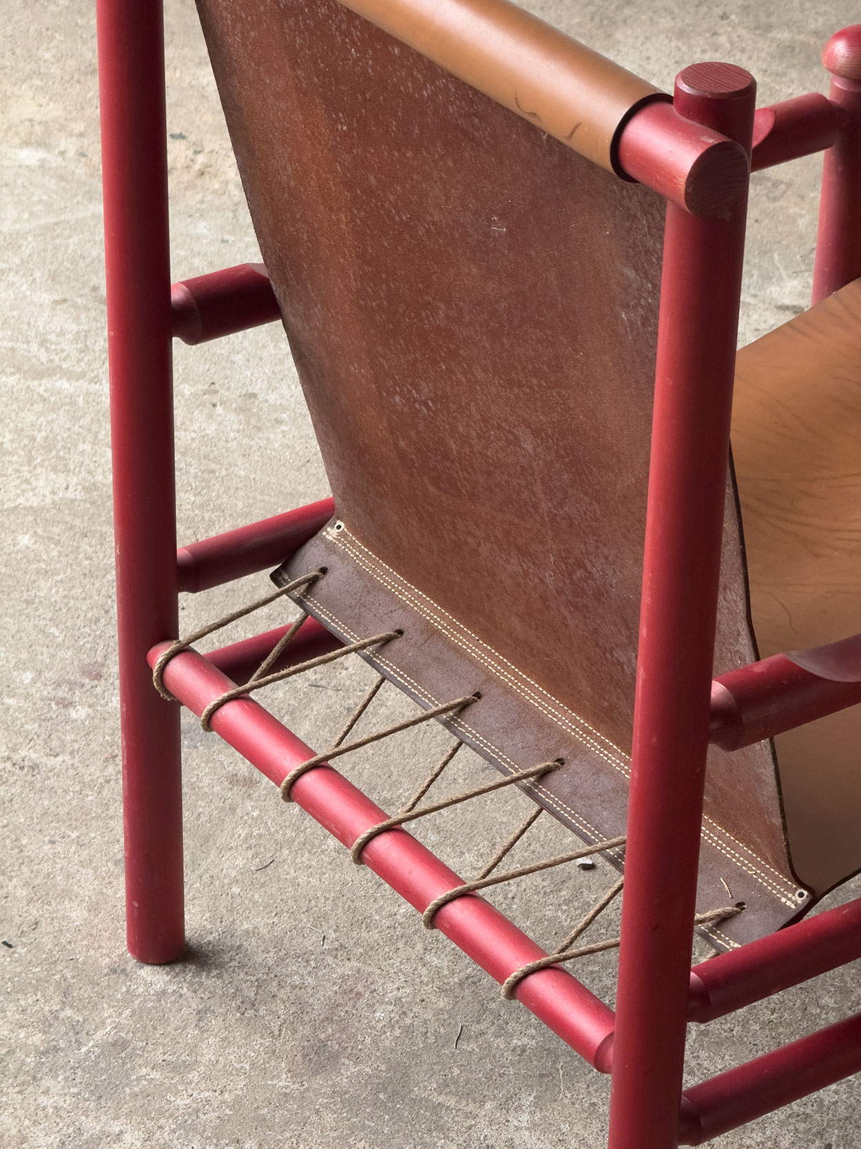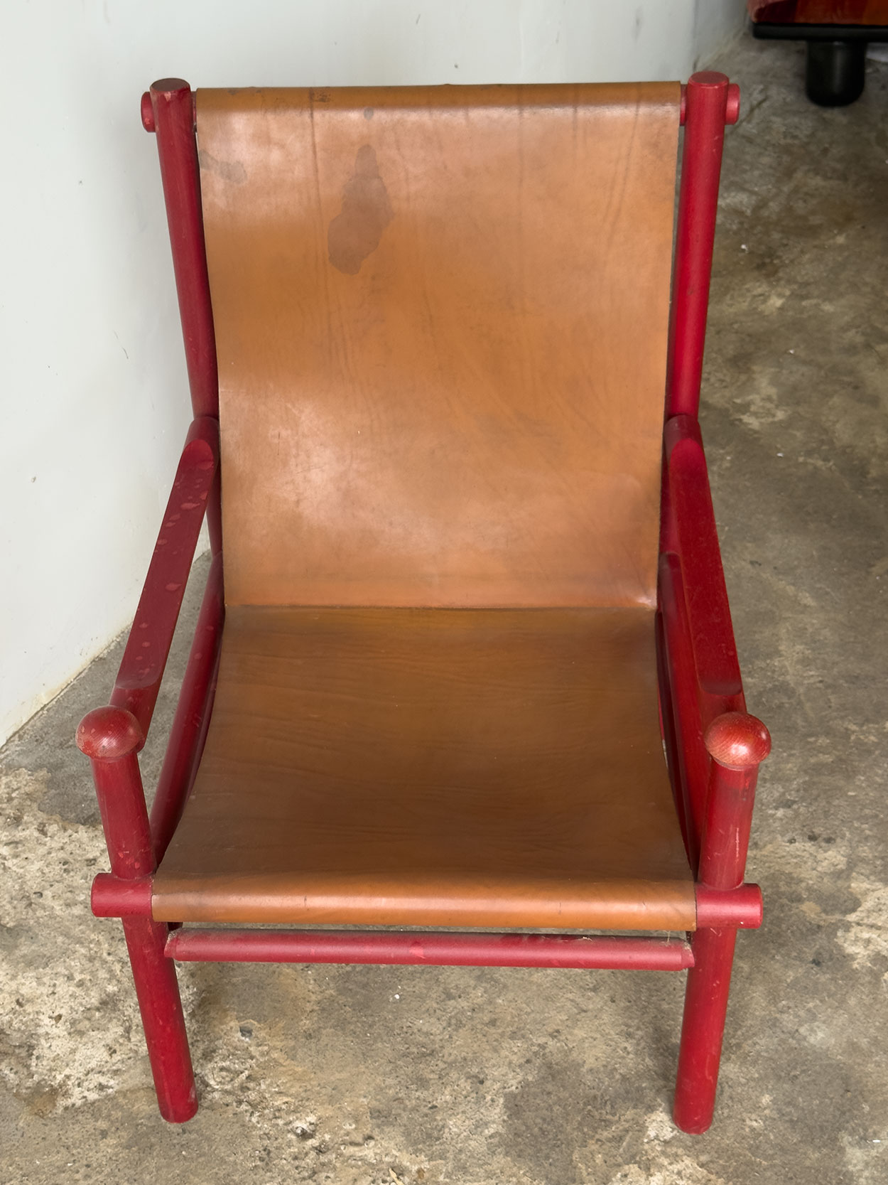 Nietypowy, nieidentyfikowalny fotel z czerwonym stelażem i grubą skórą. Kupiony w Szwajcarii. Mebel z piękną patyną. Możliwość wypożyczenia…