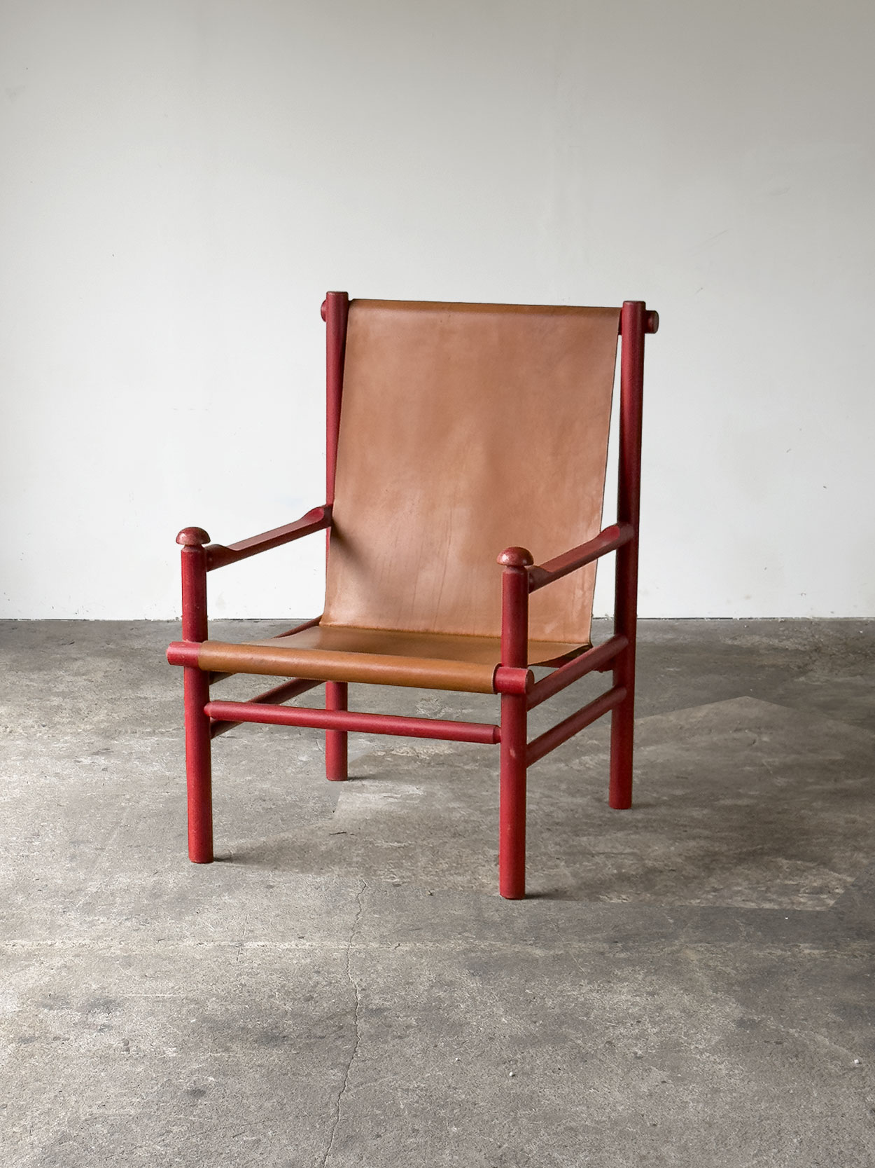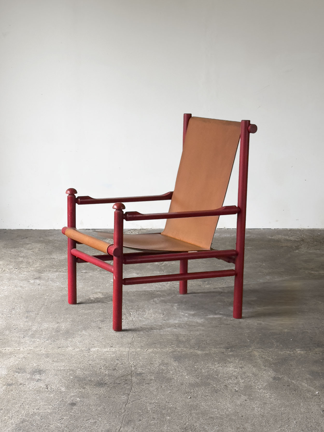 Unikatowy fotel o konstrukcji z masywnych, toczonych elementów drewnianych, wykończonych w matowym, głębokim odcieniu czerwieni. Siedzisko oraz oparcie wykonane są z jednej grubej płachty naturalnej…