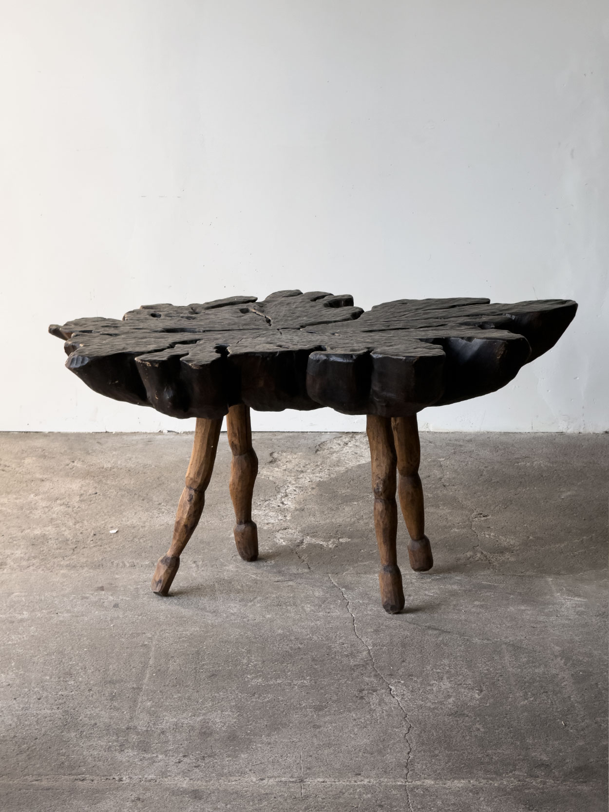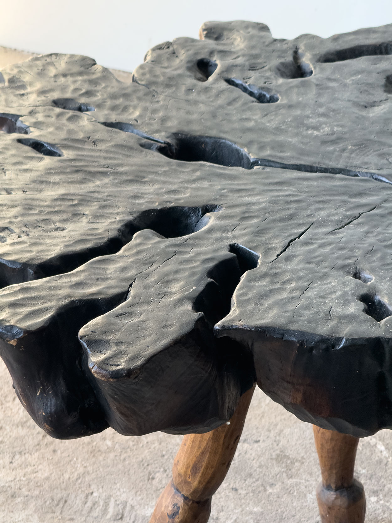 Stolik wykonany w Polsce w latach 70., w stylistyce inspirowanej tradycją zakopiańską. Blat powstał z grubego plastra litego drewna, ręcznie rzeźbionego i barwionego na ciemny,…