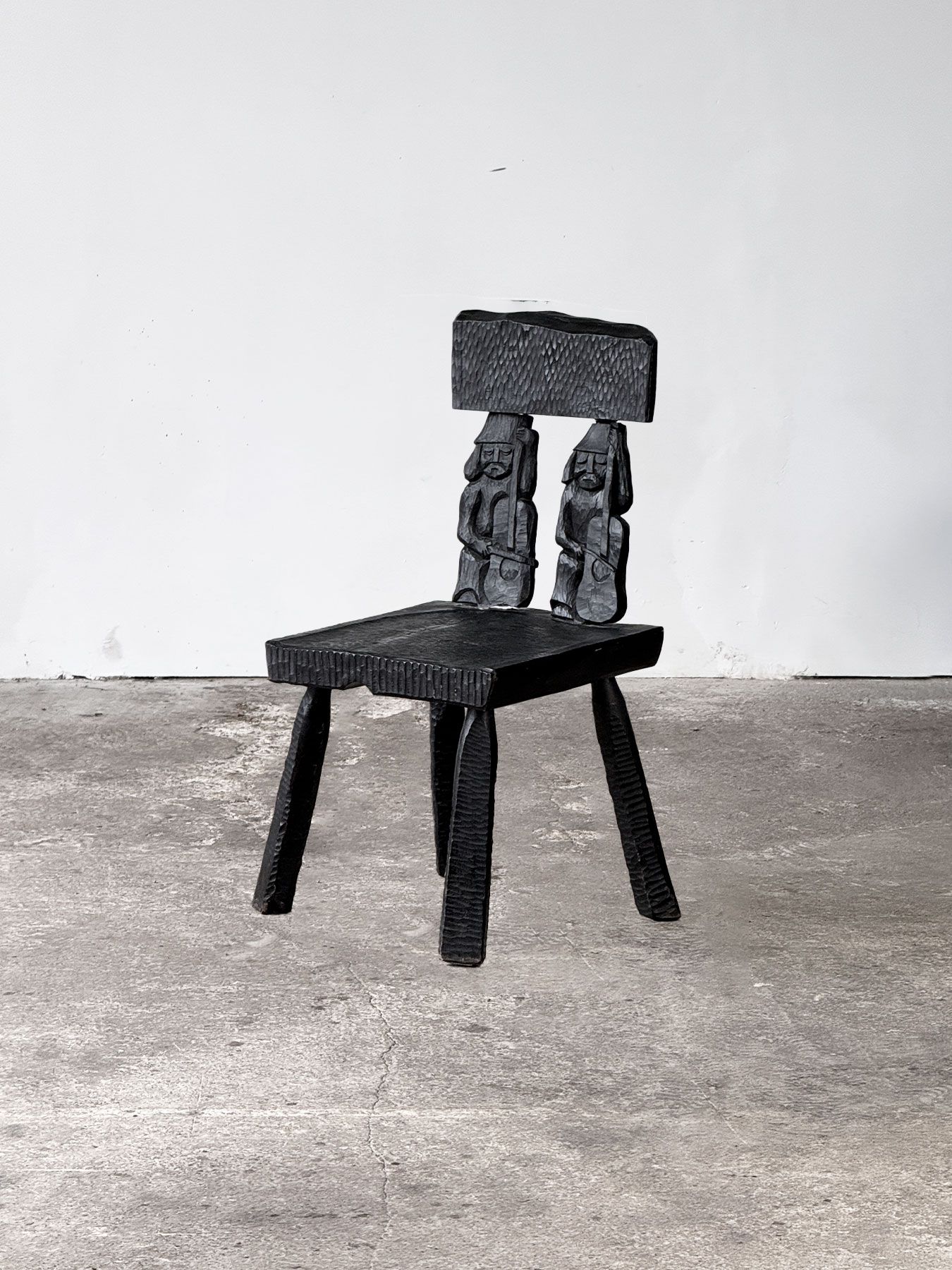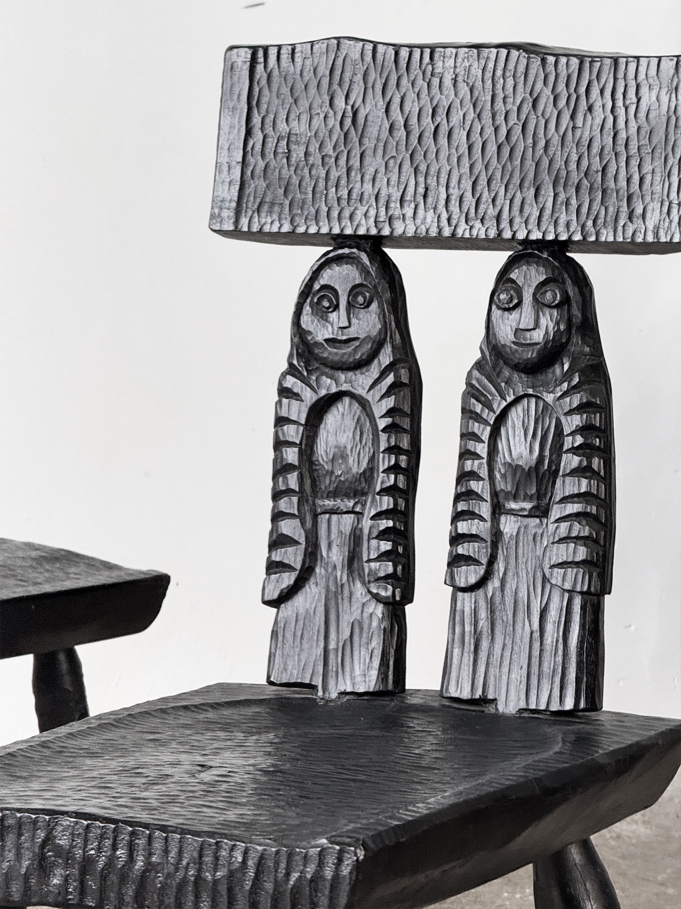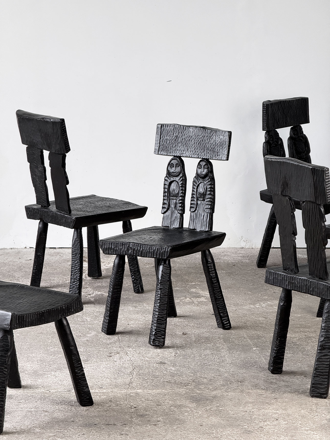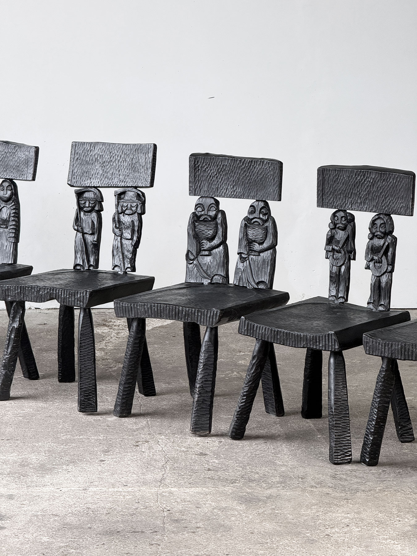 Zestaw sześciu rzeźbionych krzeseł w stylu zakopiańskim. Krzesła są solidne i masywne, najprawdopodobniej wykonane z dębu, z bogato zdobionymi elementami z olchy, wykończonymi czarną politurą. Siedziska oraz nogi zostały ciosane, natomiast oparcia każdego krzesła zdobią unikalne rzeźby przedstawiające różne postacie. To wyjątkowe meble stworzone na indywidualne zamówienie.