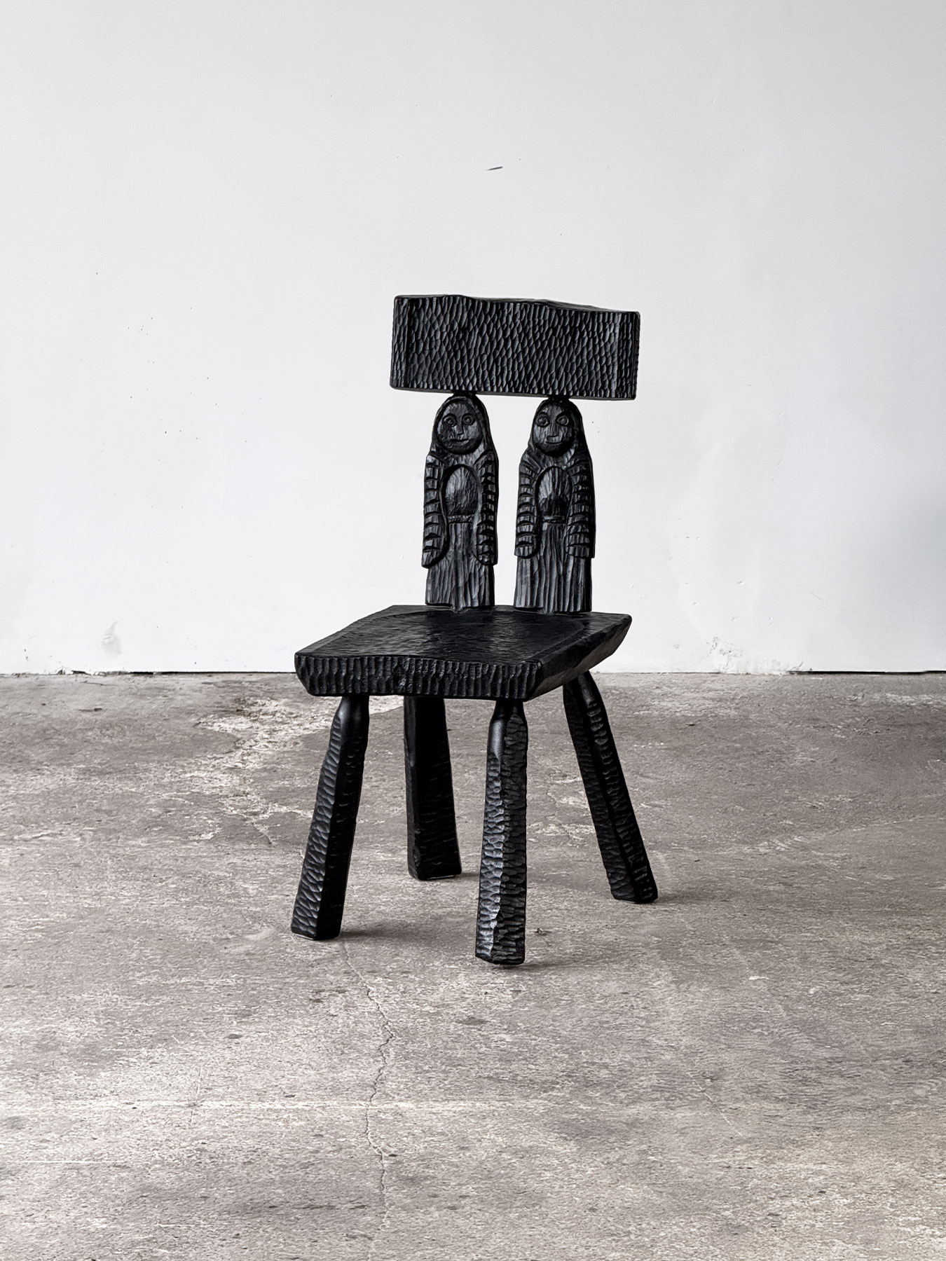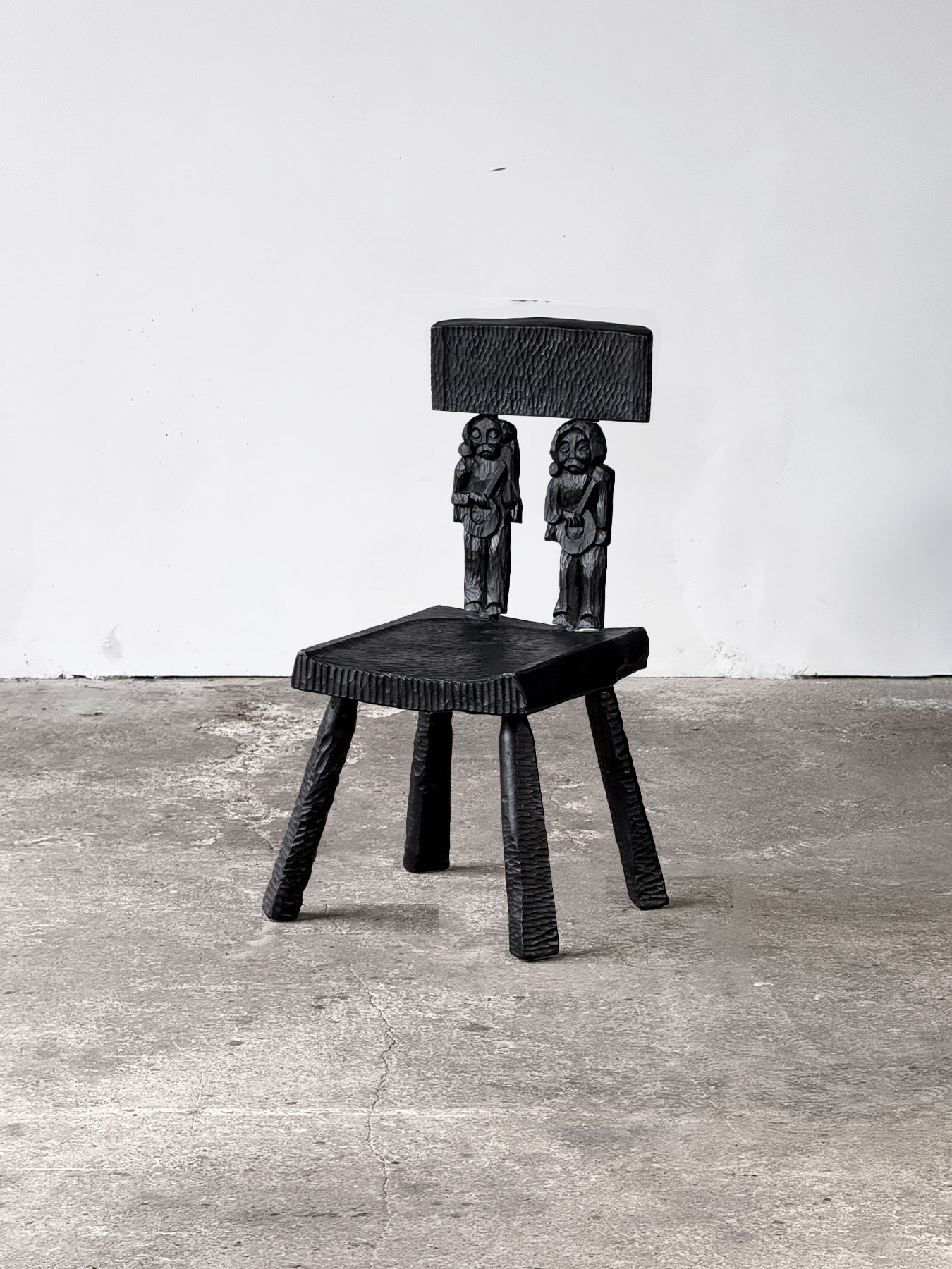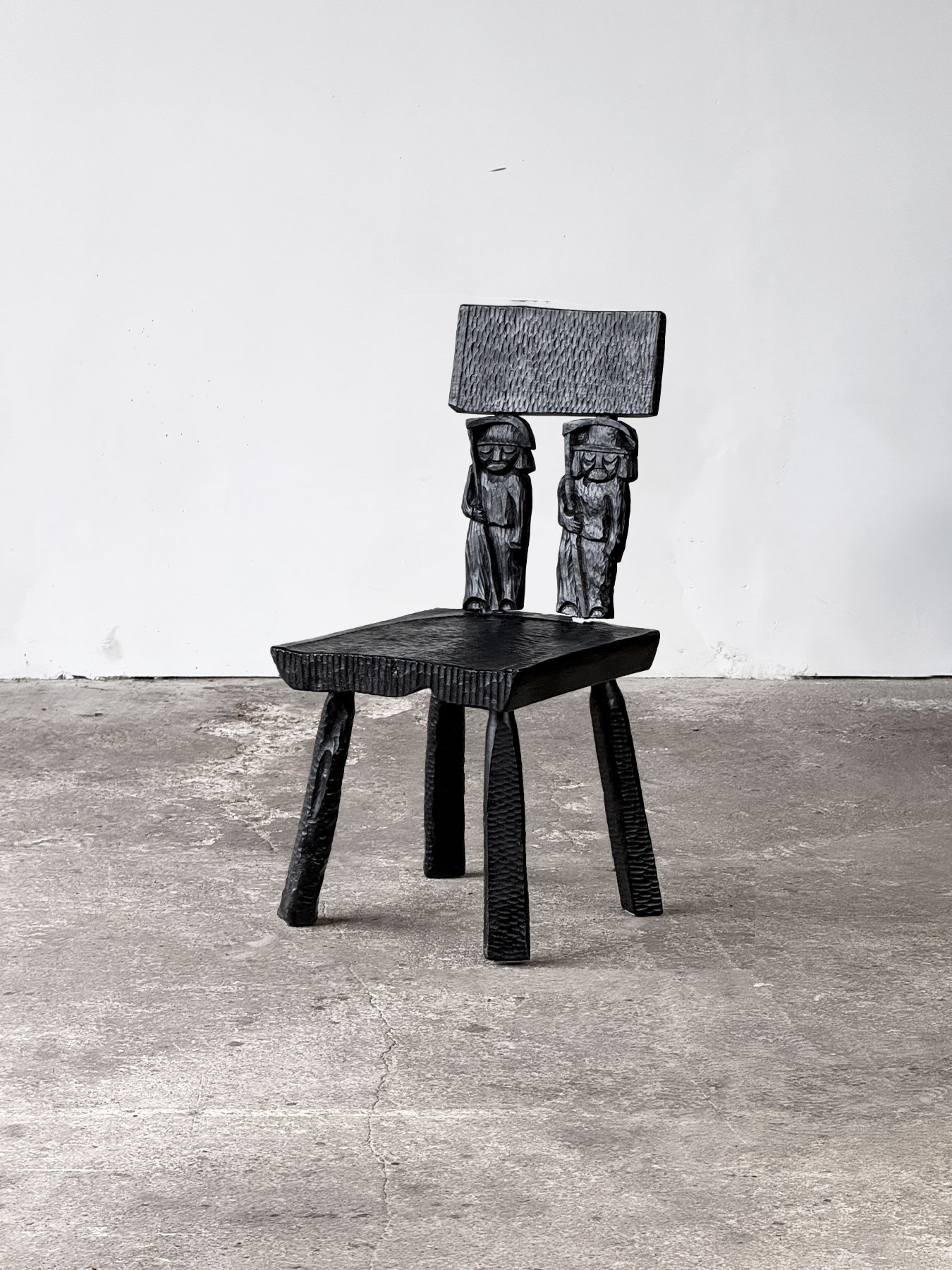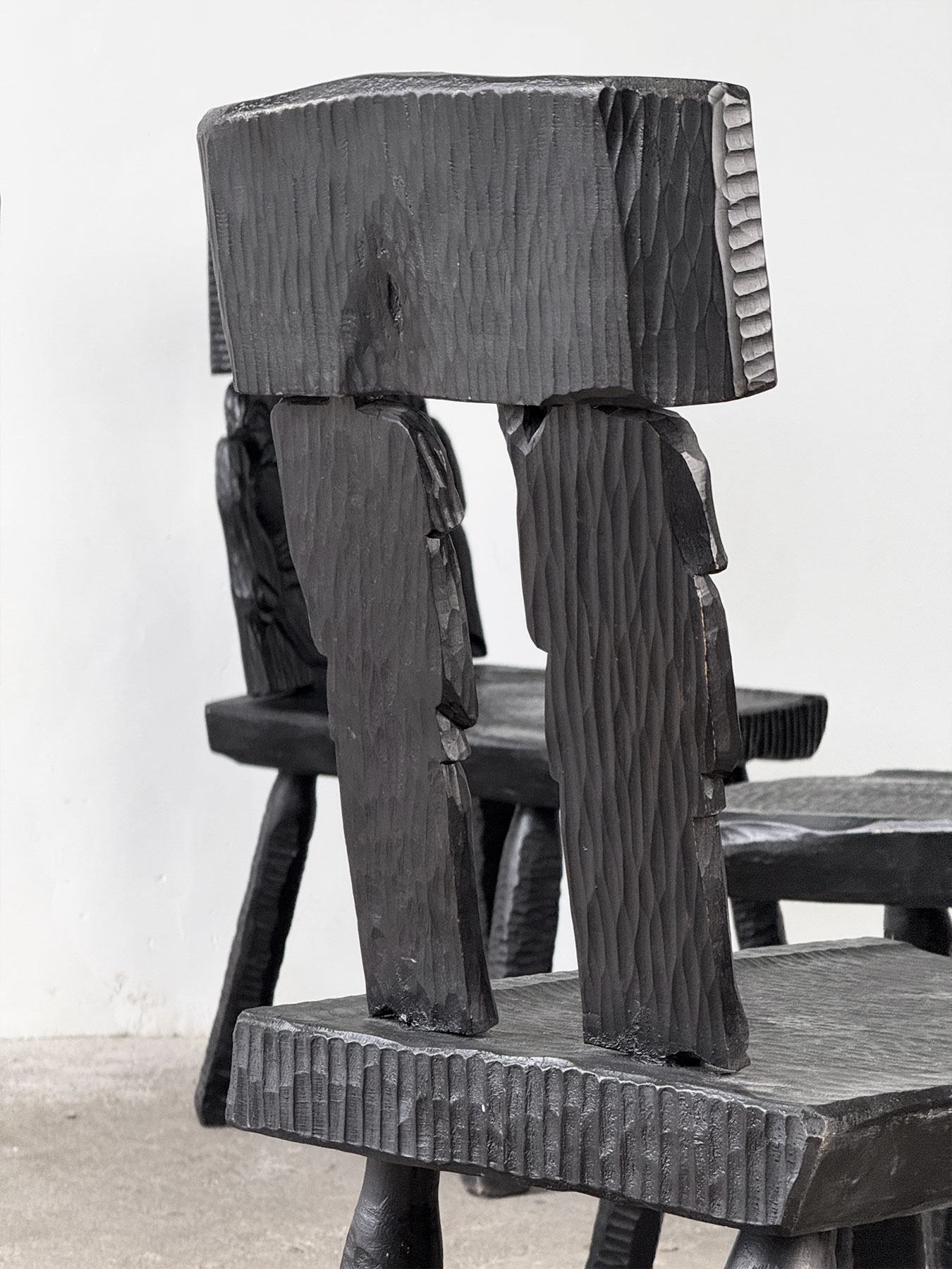 Zestaw sześciu rzeźbionych krzeseł w stylu zakopiańskim. Krzesła są solidne i masywne, najprawdopodobniej wykonane z dębu, z bogato zdobionymi elementami z olchy, wykończonymi czarną politurą. Siedziska oraz nogi zostały ciosane, natomiast oparcia każdego krzesła zdobią unikalne rzeźby przedstawiające różne postacie. To wyjątkowe meble stworzone na indywidualne zamówienie.