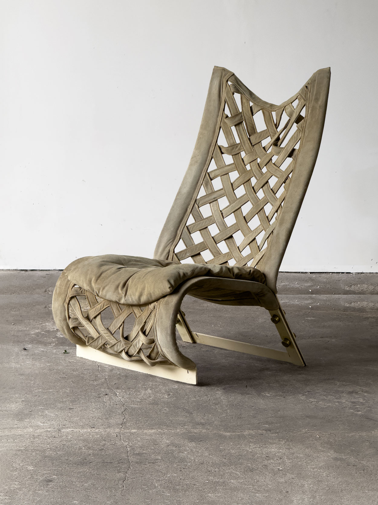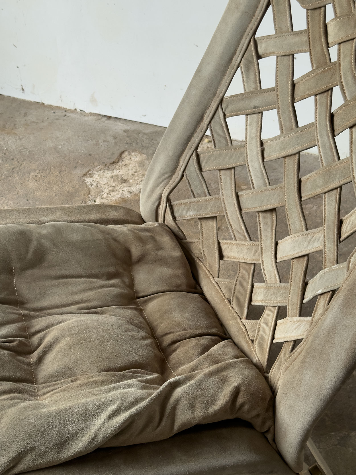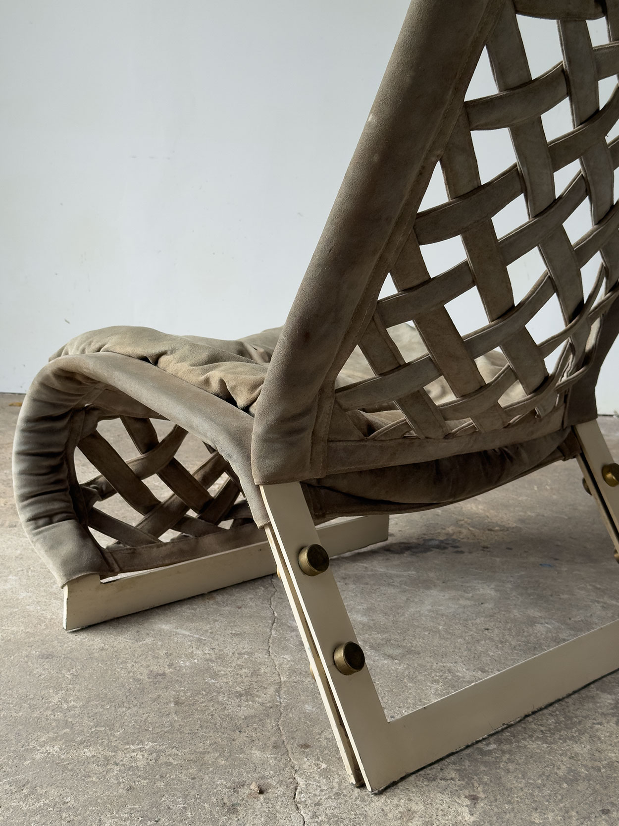 Konstrukcja fotela opiera się na solidnych, stalowych profilach lakierowanych na beżowo. Siedzisko i oparcie wykonane zostały z plecionego zamszu w kolorze oliwkowym, mocowanego do ramy za pomocą śrub z polerowanego brązu. Wykończenie nosi estetyczną patynę w postaci przebarwień, które dodają materiałowi charakteru i potwierdzają jego oryginalność. Konstrukcja mechanicznie bez wad, w pełni stabilna.